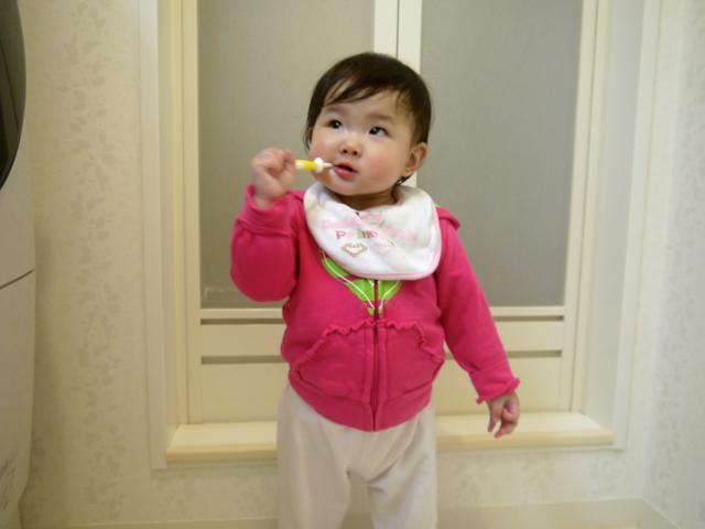 ママもこちら側で磨いているので、樹花はその真似っこをしているだけです(笑)いまは下の歯が2本、上の歯が1本、ぜんぶで3本の歯があります。虫歯になったら痛くて大変だから毎日ごはんのあとはしっかり磨くことにしています。