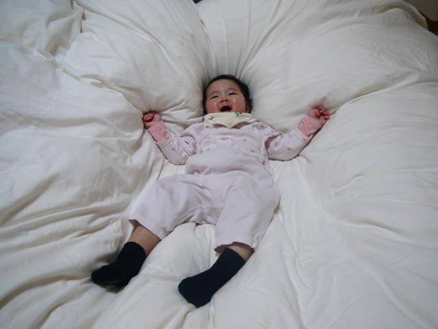 昼寝を3時間したせいか、夜は元気でなかなか寝てくれなかったこのちゃん。ふかふかお布団にど〜んと投げ込むとキャーキャー笑って楽しいみたい☆