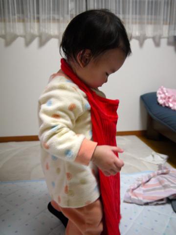 夜、洗濯物の山からパパのタンクトップを選んで首にかけるこのちゃん。ママのキャミソールを自分に合わせてみたり、パパのを着てみたり...いろいろできるようになってる。