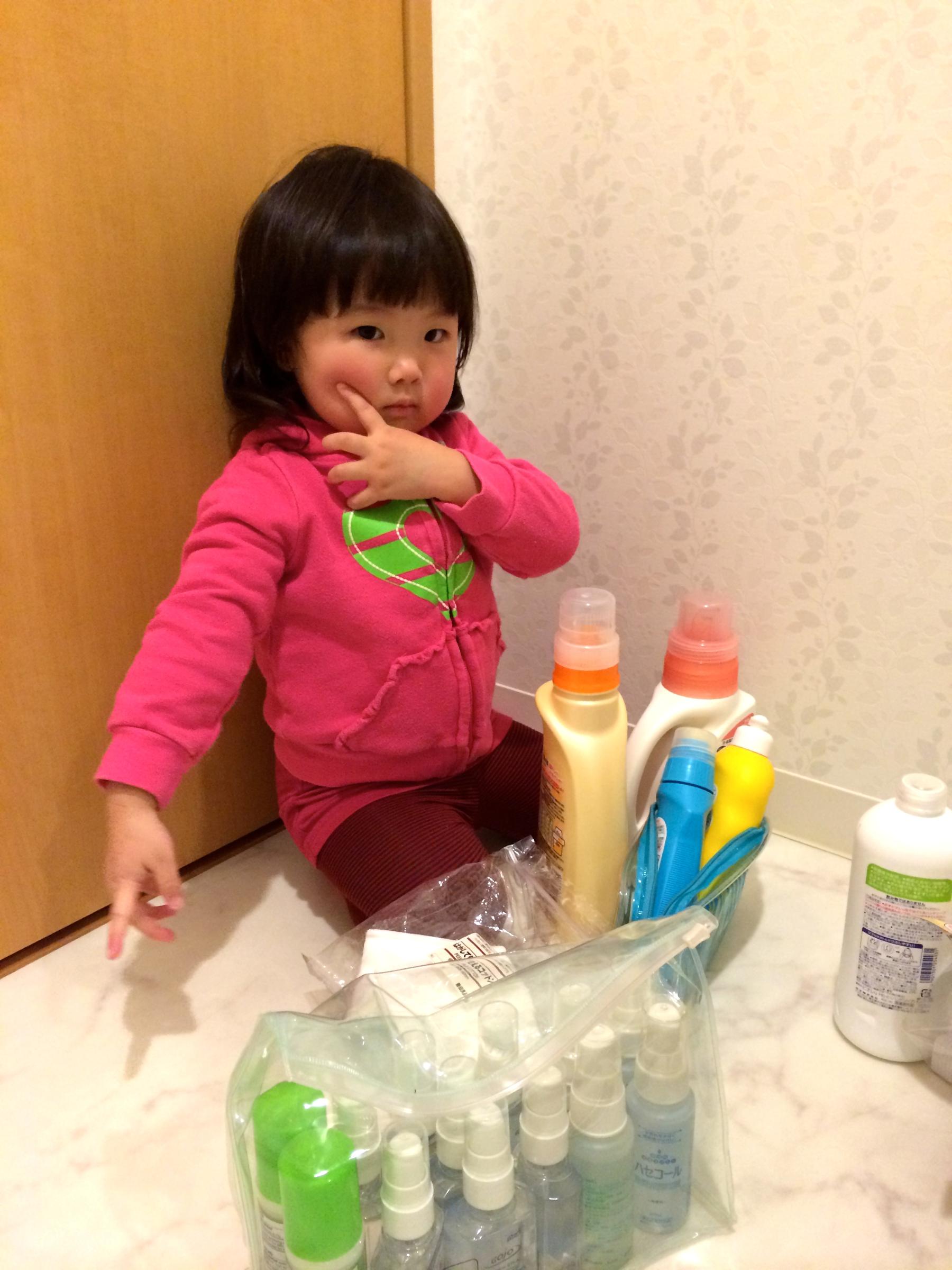 もう寝る時間なのに遊び始めてしまいました...流しの引き出しからどんどん物を出してせっせと何かやっています。カメラを向けるとにこ〜っとポーズをしてくれたのだけど、まだ遊びたいから片手の指だけほっぺに残して笑ってるつもりみたい。