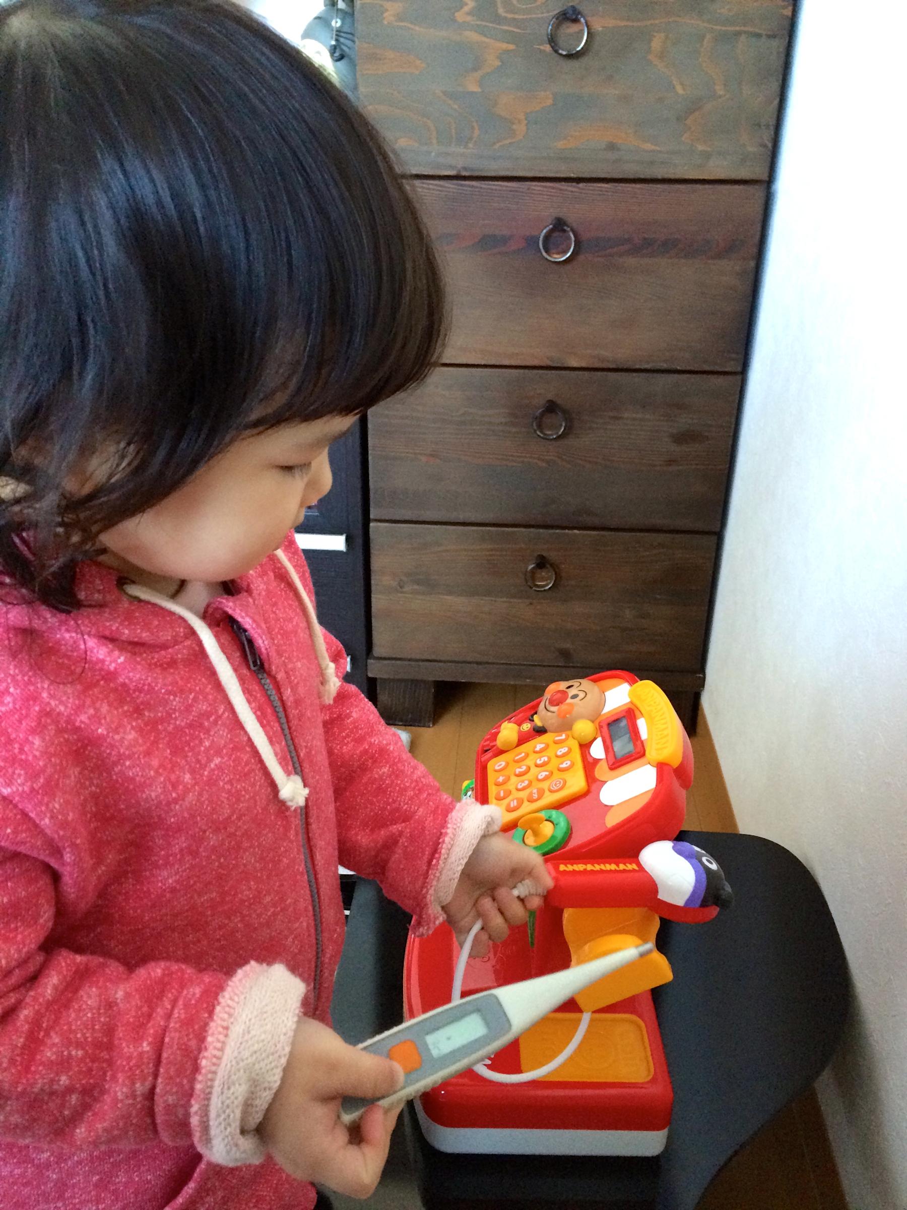 アンパンマンレジスターのバイキンマンのお熱を計ろうとしています...