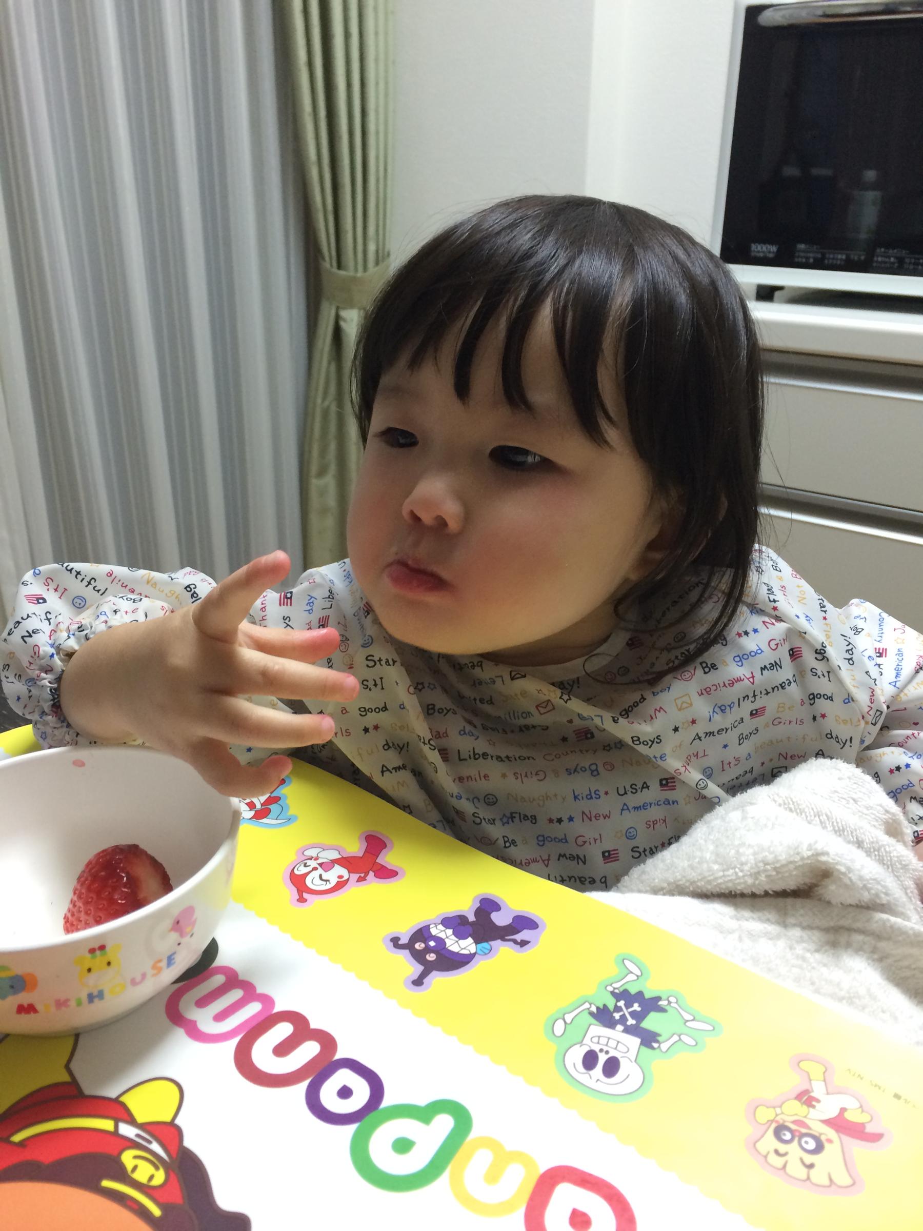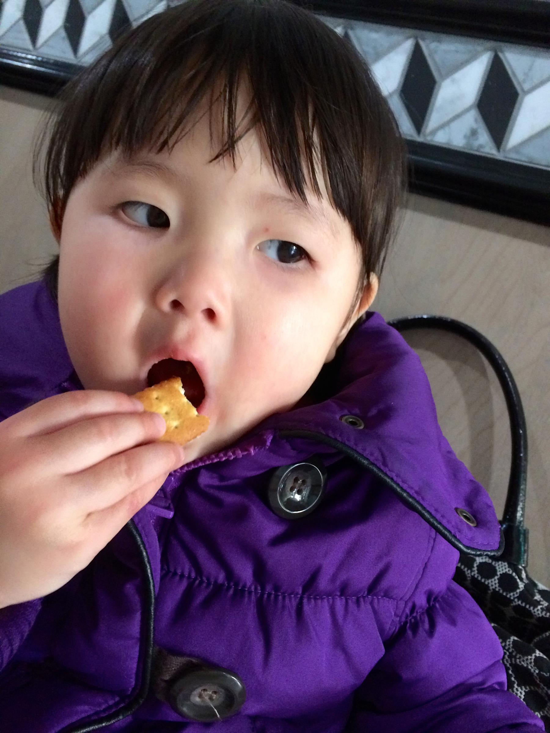 塗り薬をもらいに皮膚科へ行きました。終わったあと、外のベンチでビスコを食べるこのちゃん。