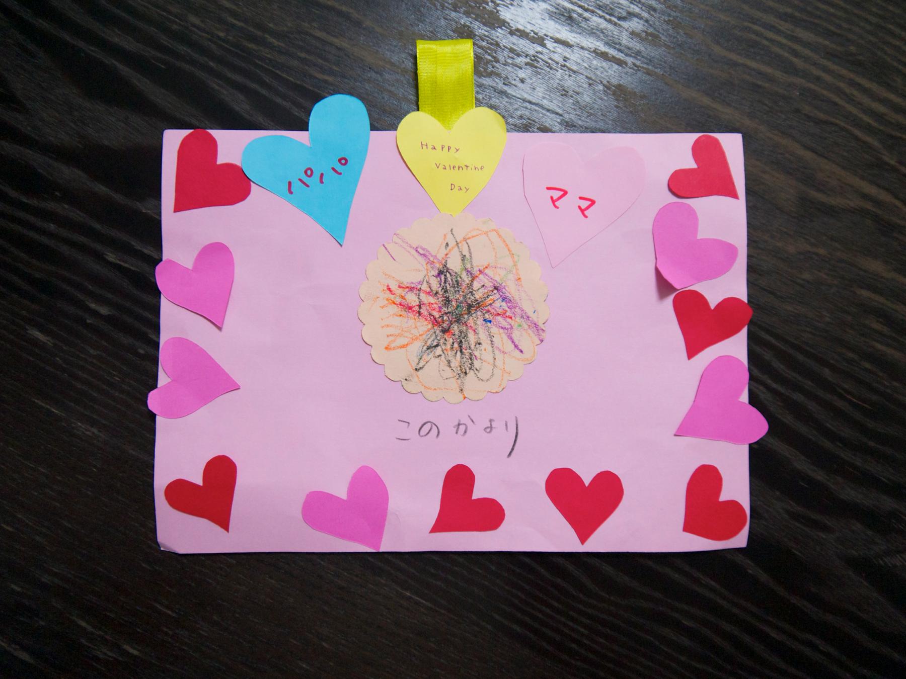 保育園でバレンタインのカードを作ってきました。パパだけでなくママ宛てでもあります。