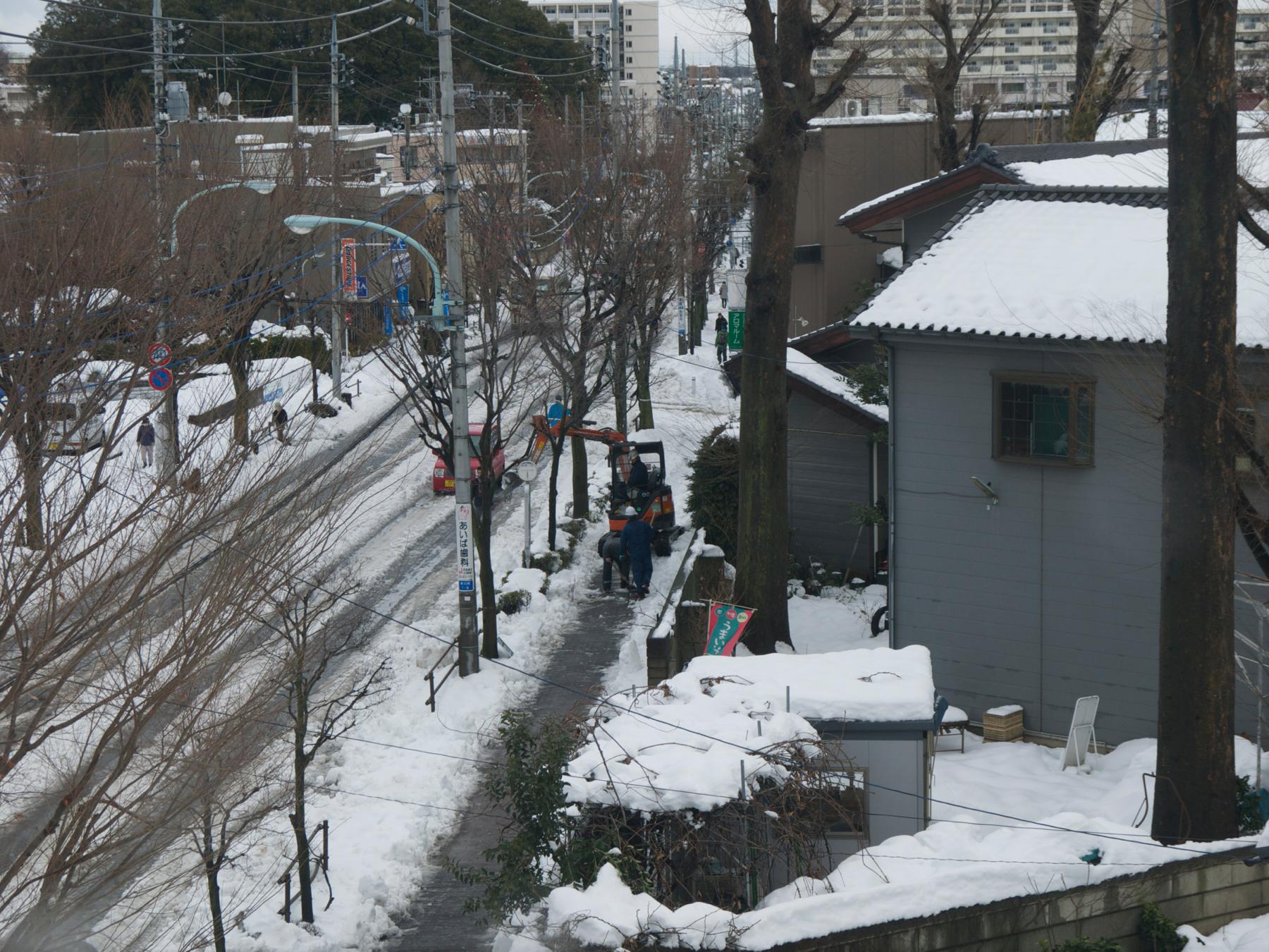 今朝起きたらショベルカーが歩道の雪かきをしていました。ニュースでは東京は17センチ積もったと言っていました!