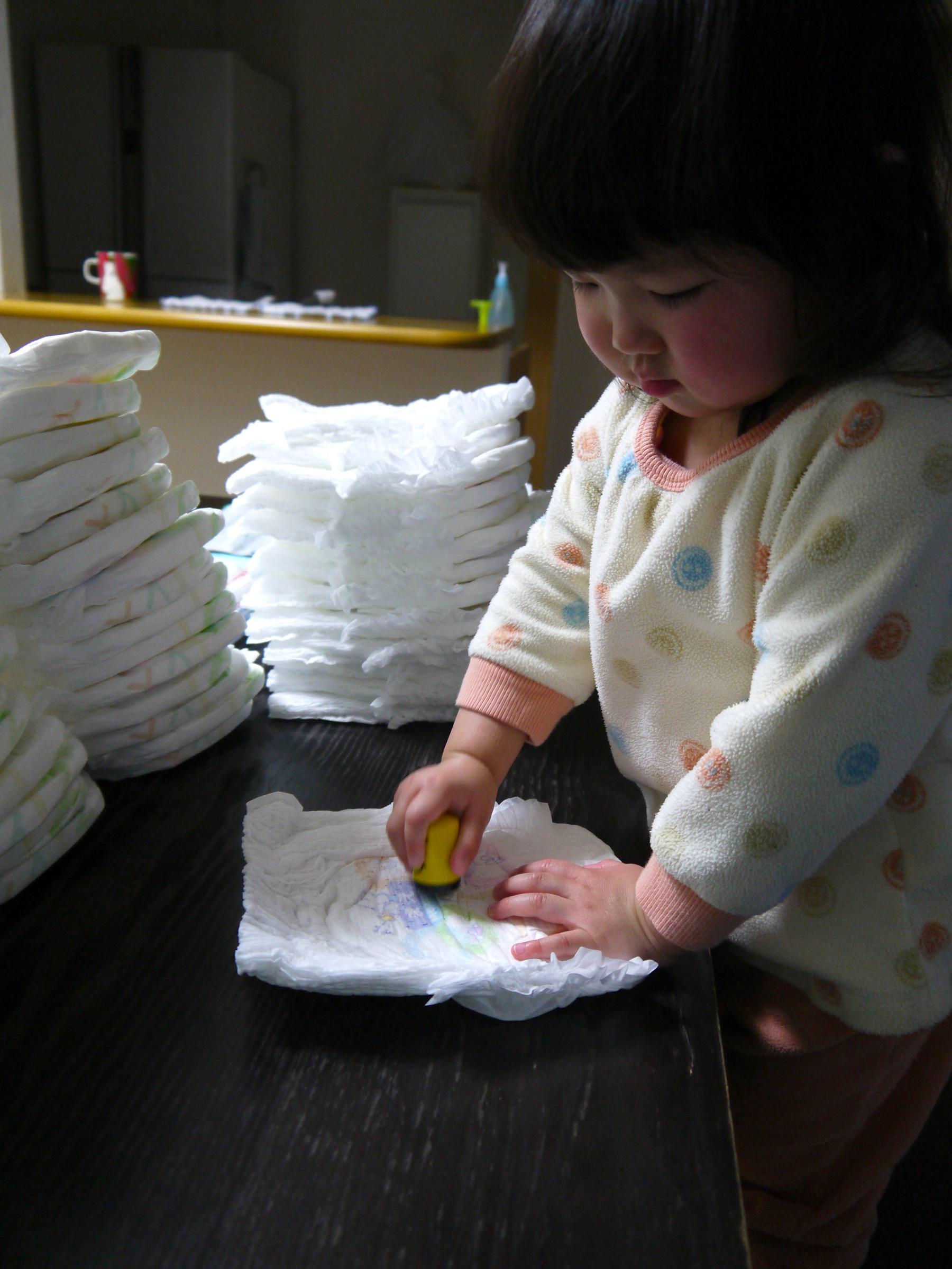 保育園に持っていくオムツにぷ〜さんの名前入りスタンプを押しています。