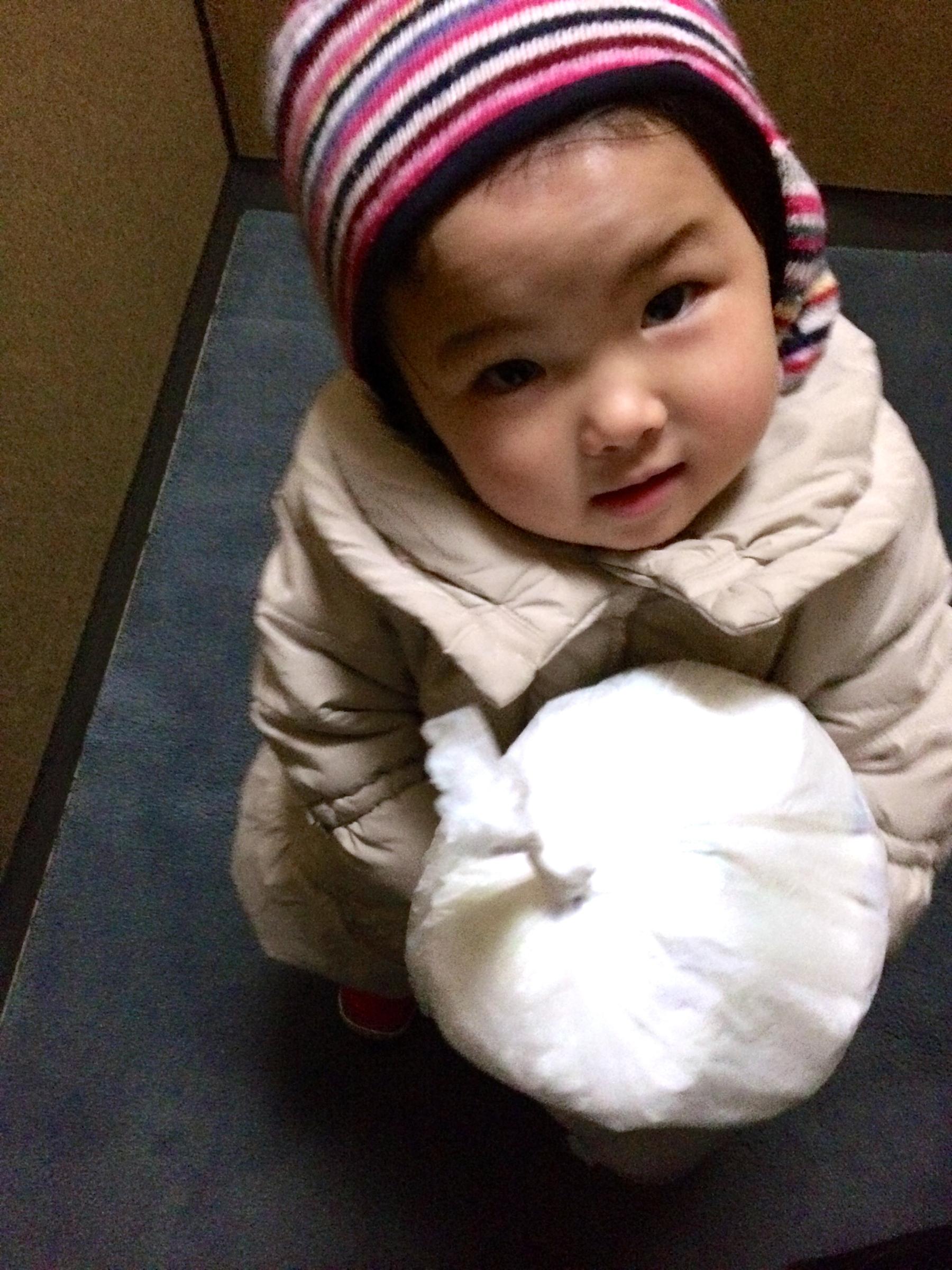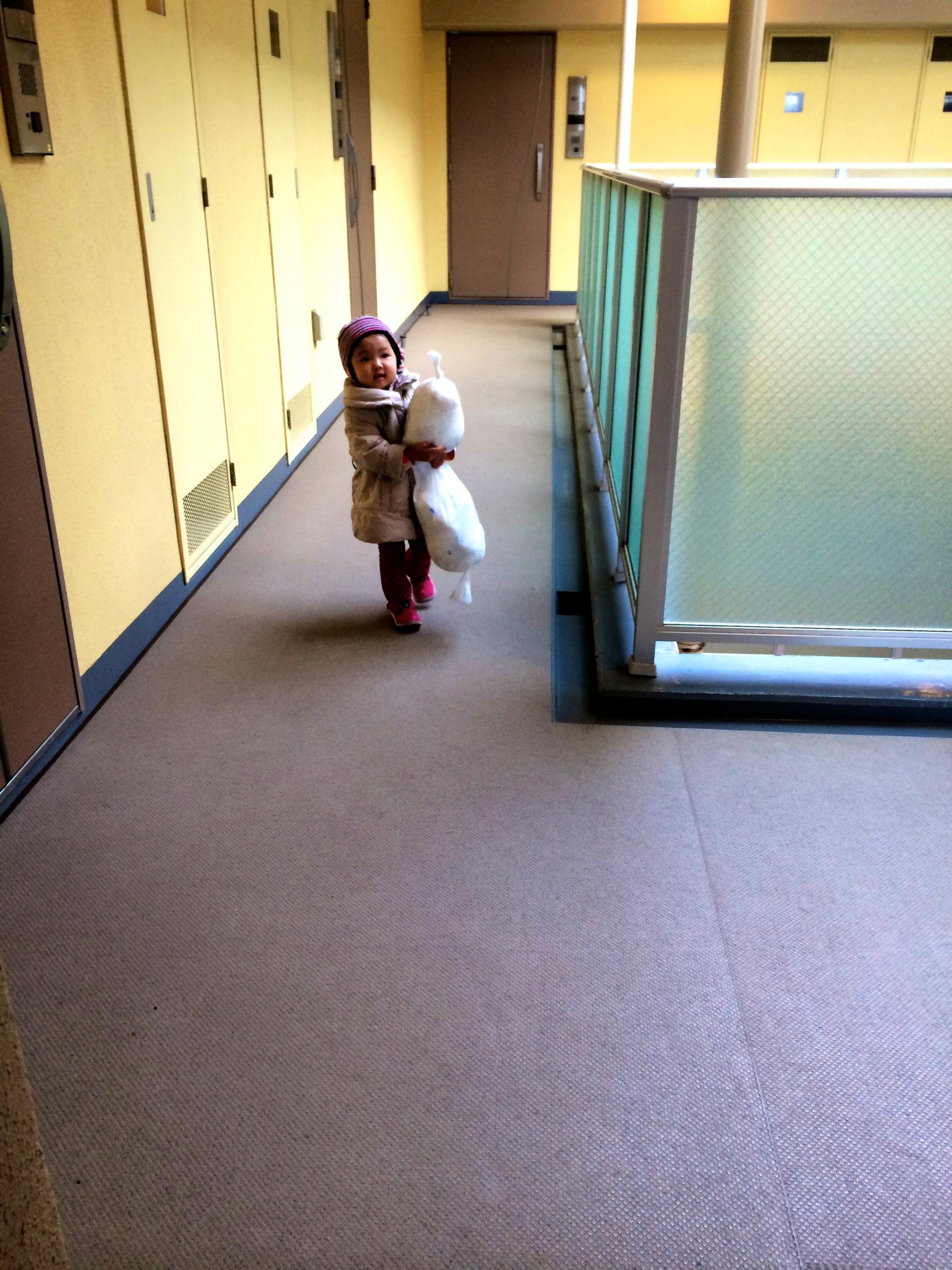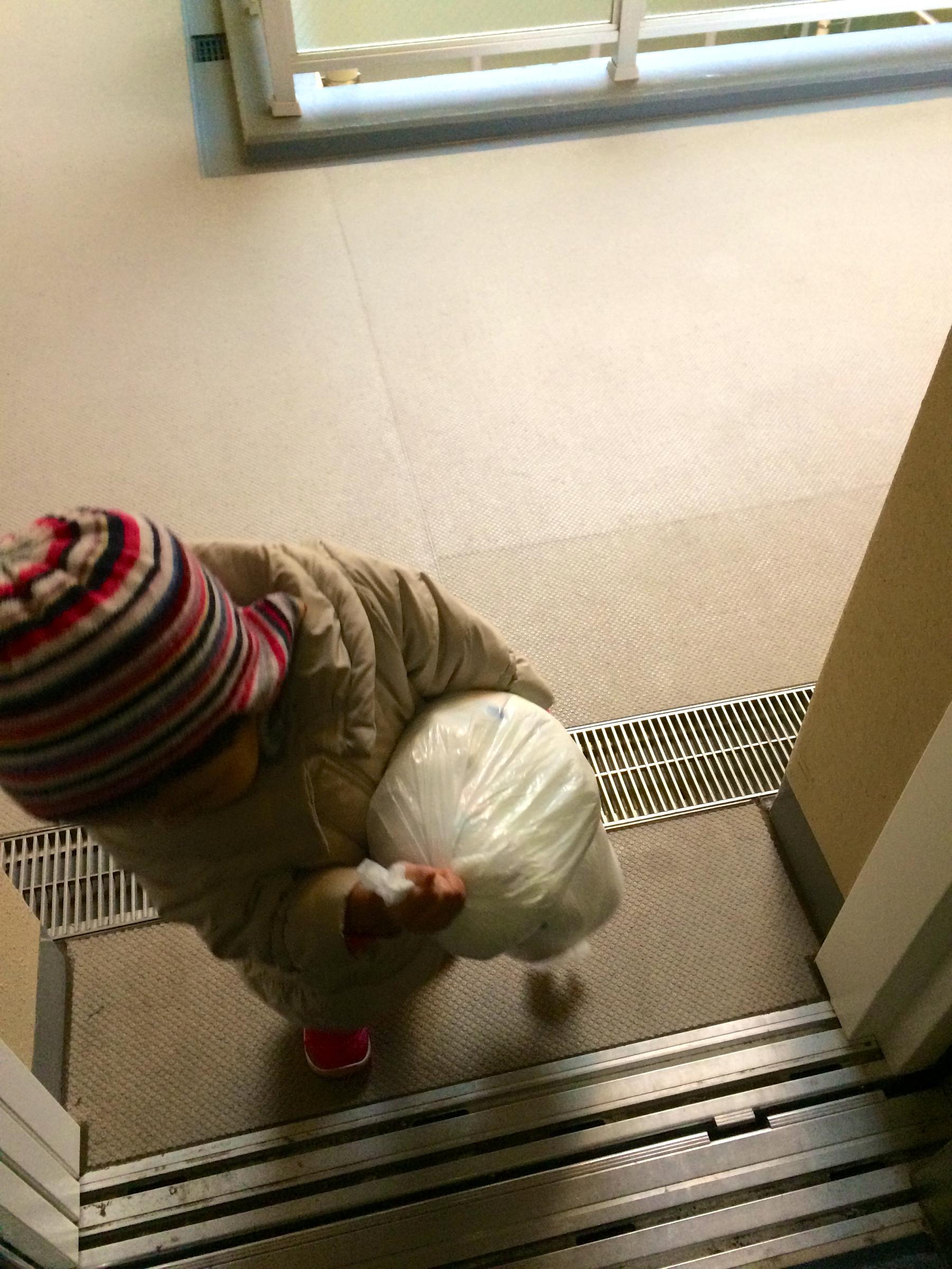 重かったみたいでエレベータのなかで「ママ、どうぞ」と言って渡されました。