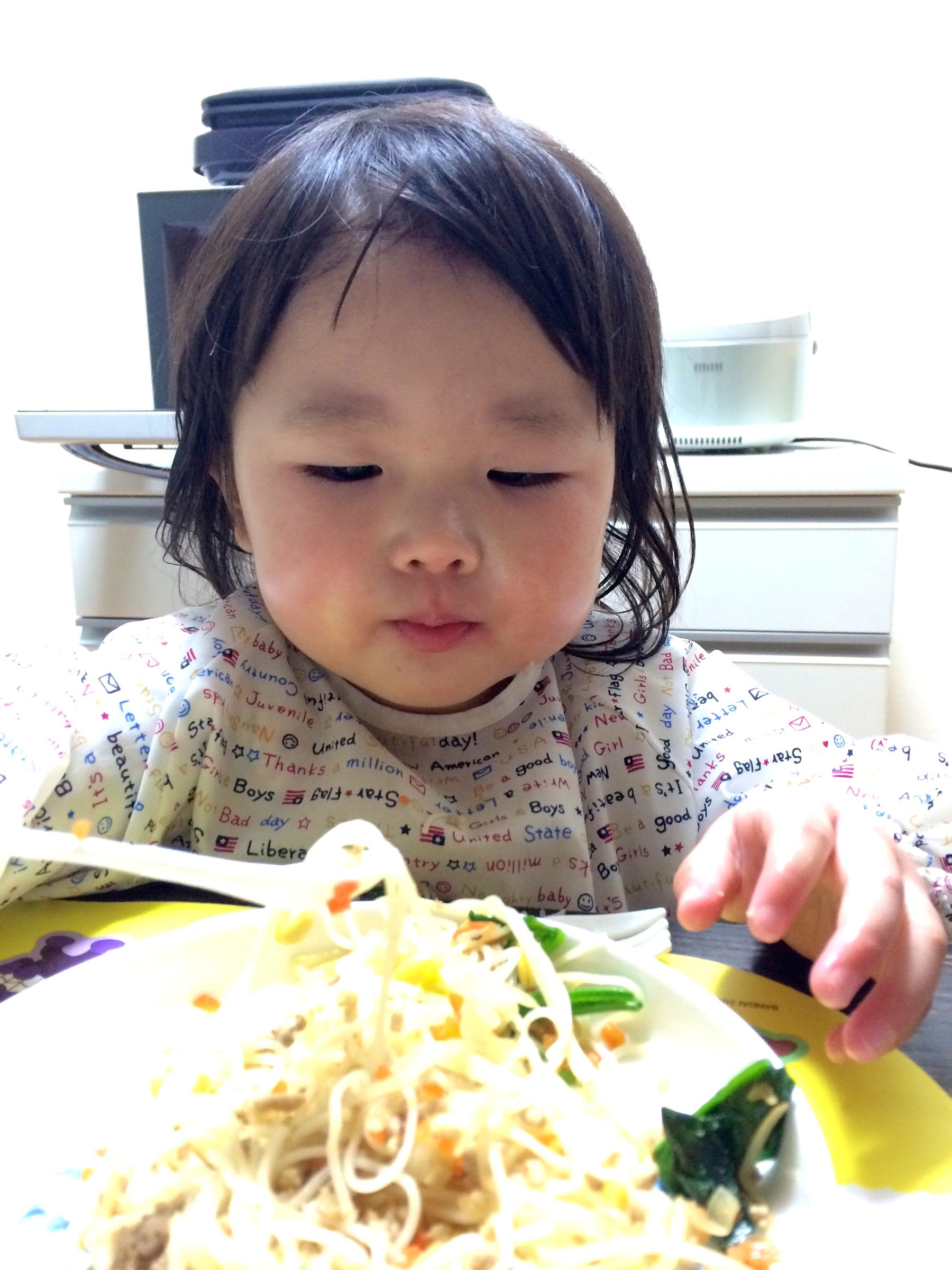 最近よく食べるようになったこのちゃん。おみそ汁を食べてママのビーフンを少し分けて、いちごを食べたと思ったらまたかぼちゃを欲しがり、最後はりんごで終わりました(笑)