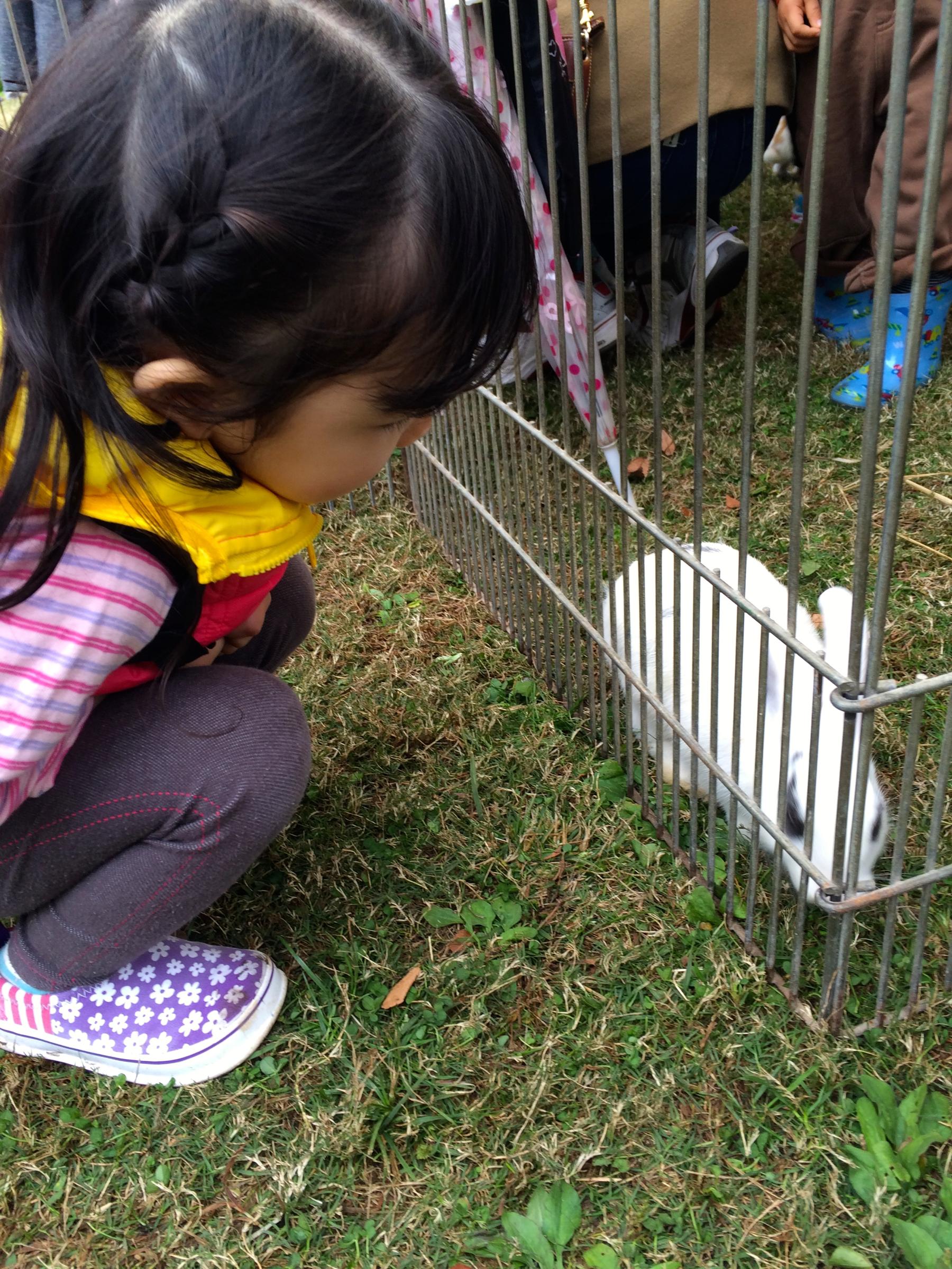 自由学園は保育園の親子イベントで来たことがあったけれど、敷地がとても広くて子供たちは芝生を走り回ったりできて楽しそうでした。動物コーナーもあって、このちゃんはうさぎをじっと見ていました。さわるのはこの前、井の頭公園でも恐がっていたので今回も見るだけにしました。