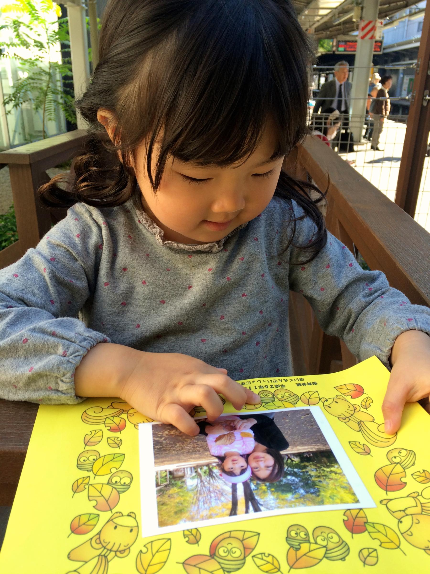 公園で先生がこのちゃんと一緒の写真を撮ってくれました。なかなかカメラ目線にならず、何度か撮り直したのですが、ふたりで落ち葉を手に持って季節感のある良い写真になりました。