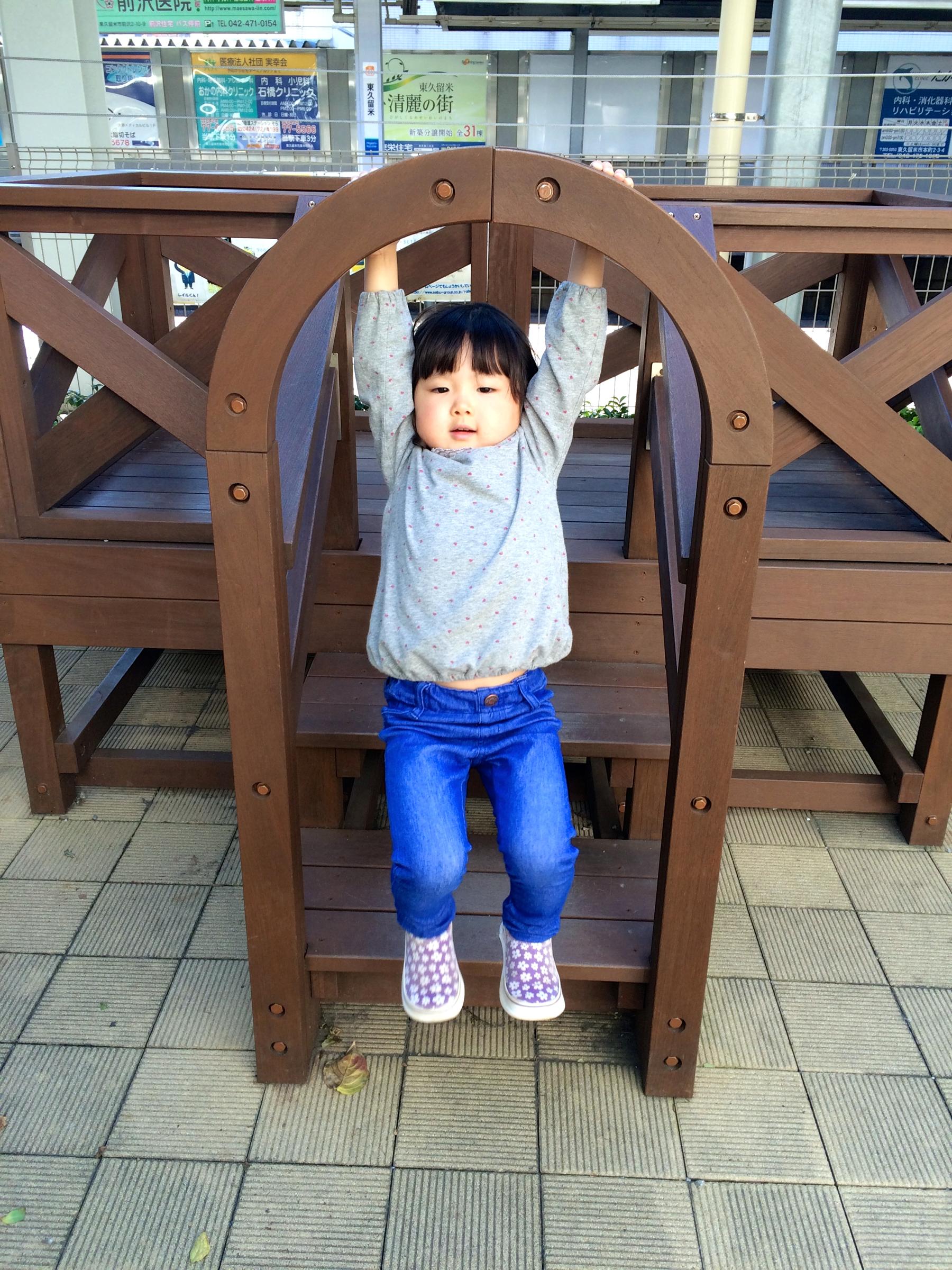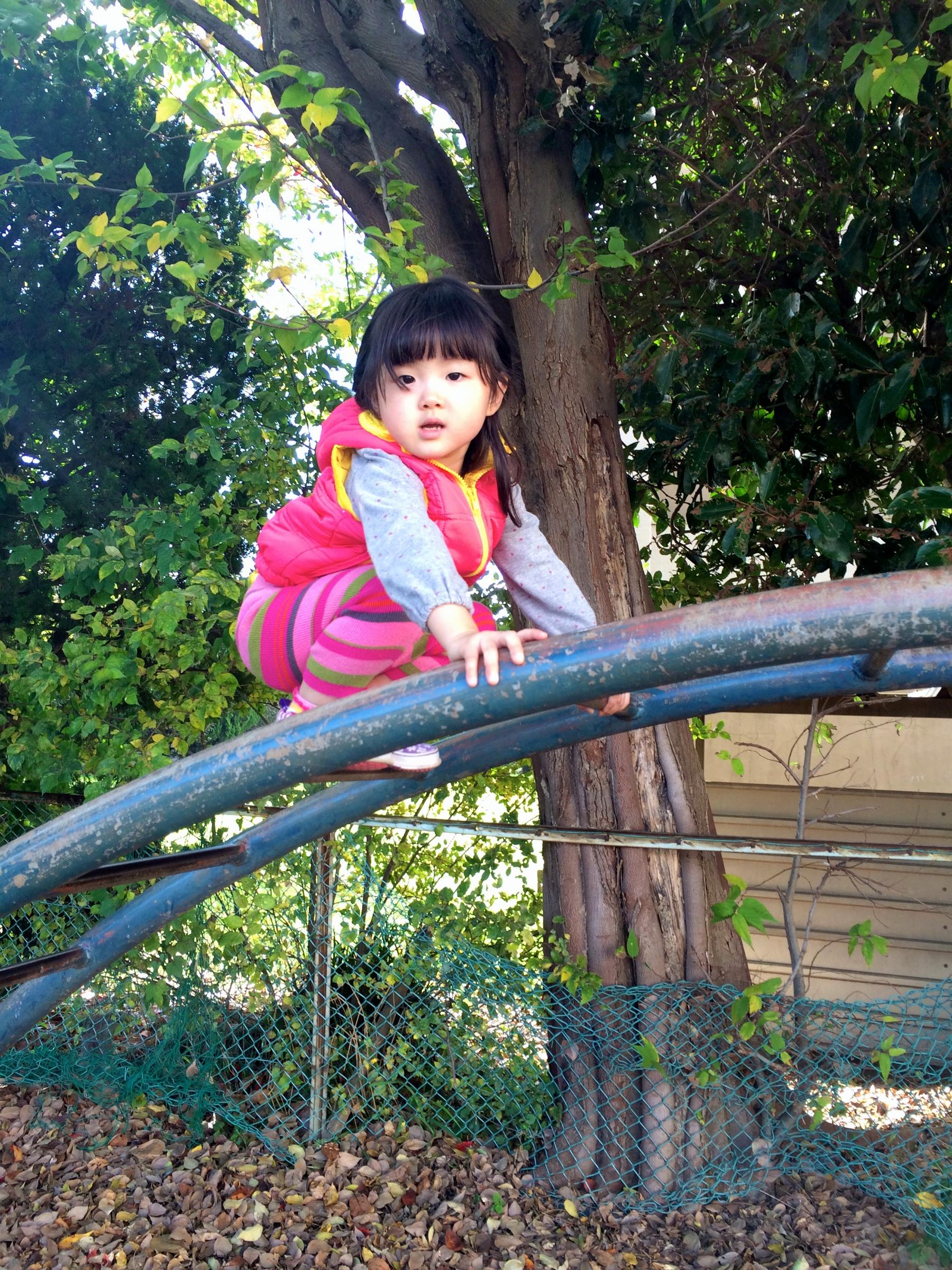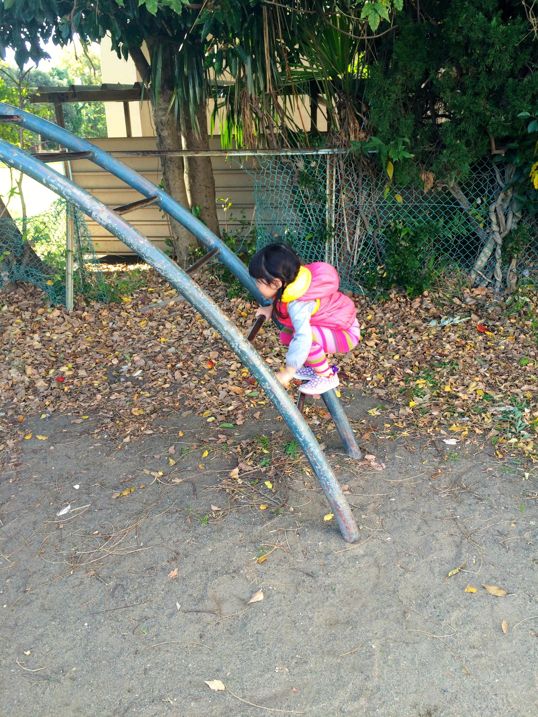 次はうんていと、もうひとつ別のぶらんこに乗りました。うんていは恐がらずにどんどん上るのでママのほうが大丈夫か心配になりましたが、さすがに高いところまでくると「このちゃんこわい」と言ってそれ以上は上らずちゃんと自分で下りてきたので、きちんと自分で判断できるところに感心しました。