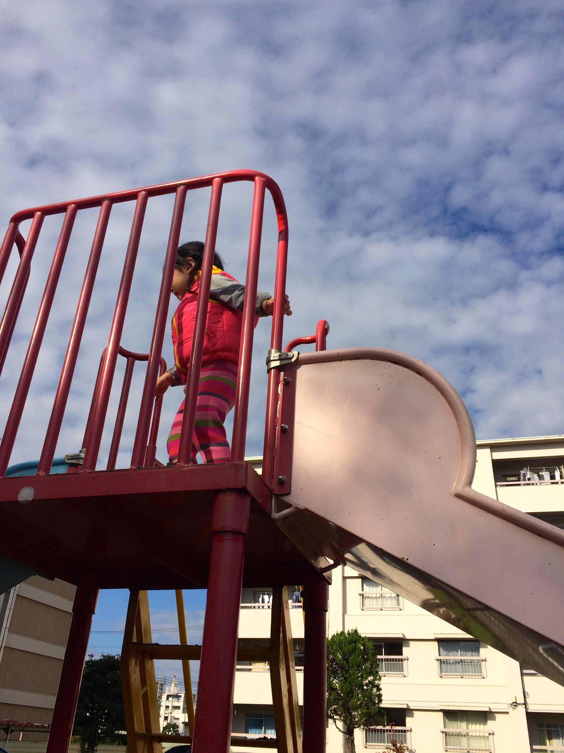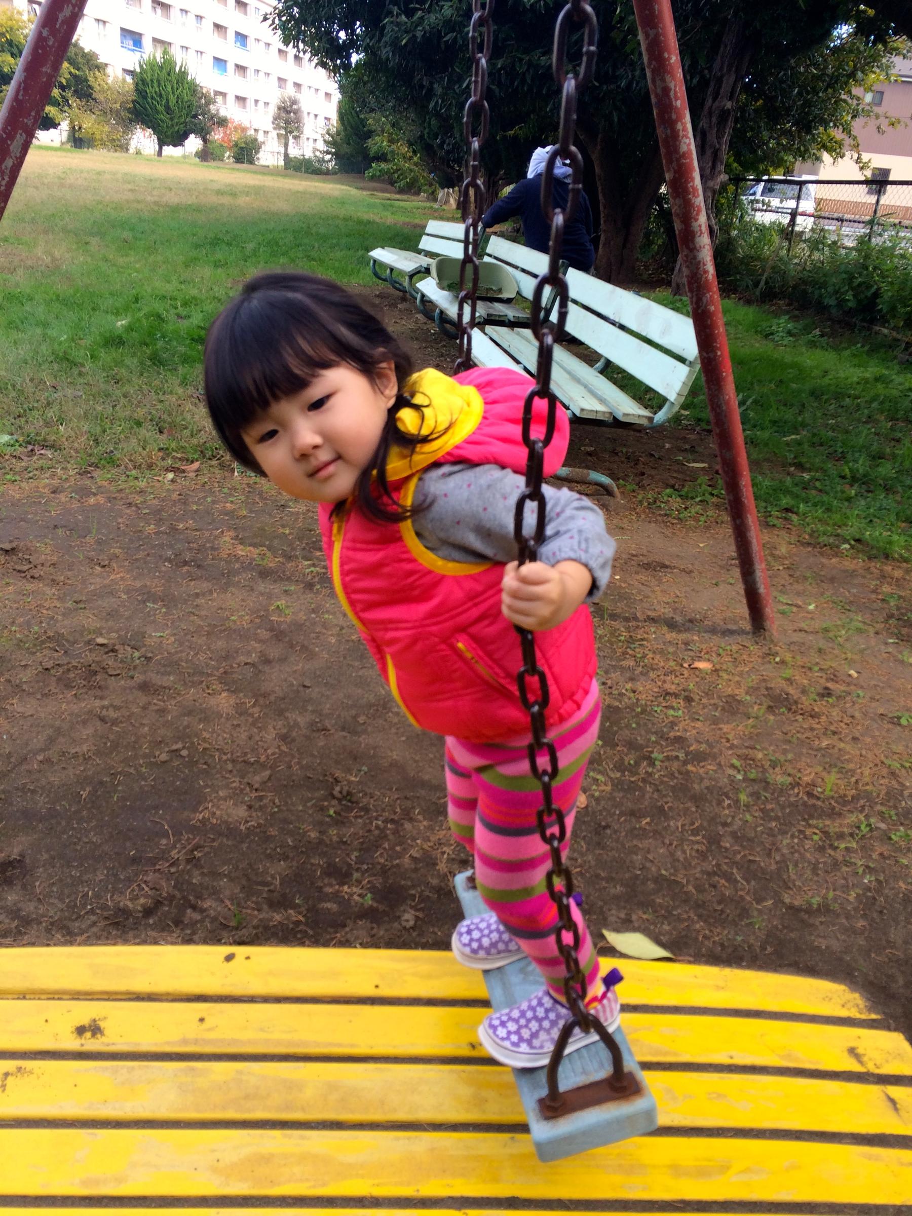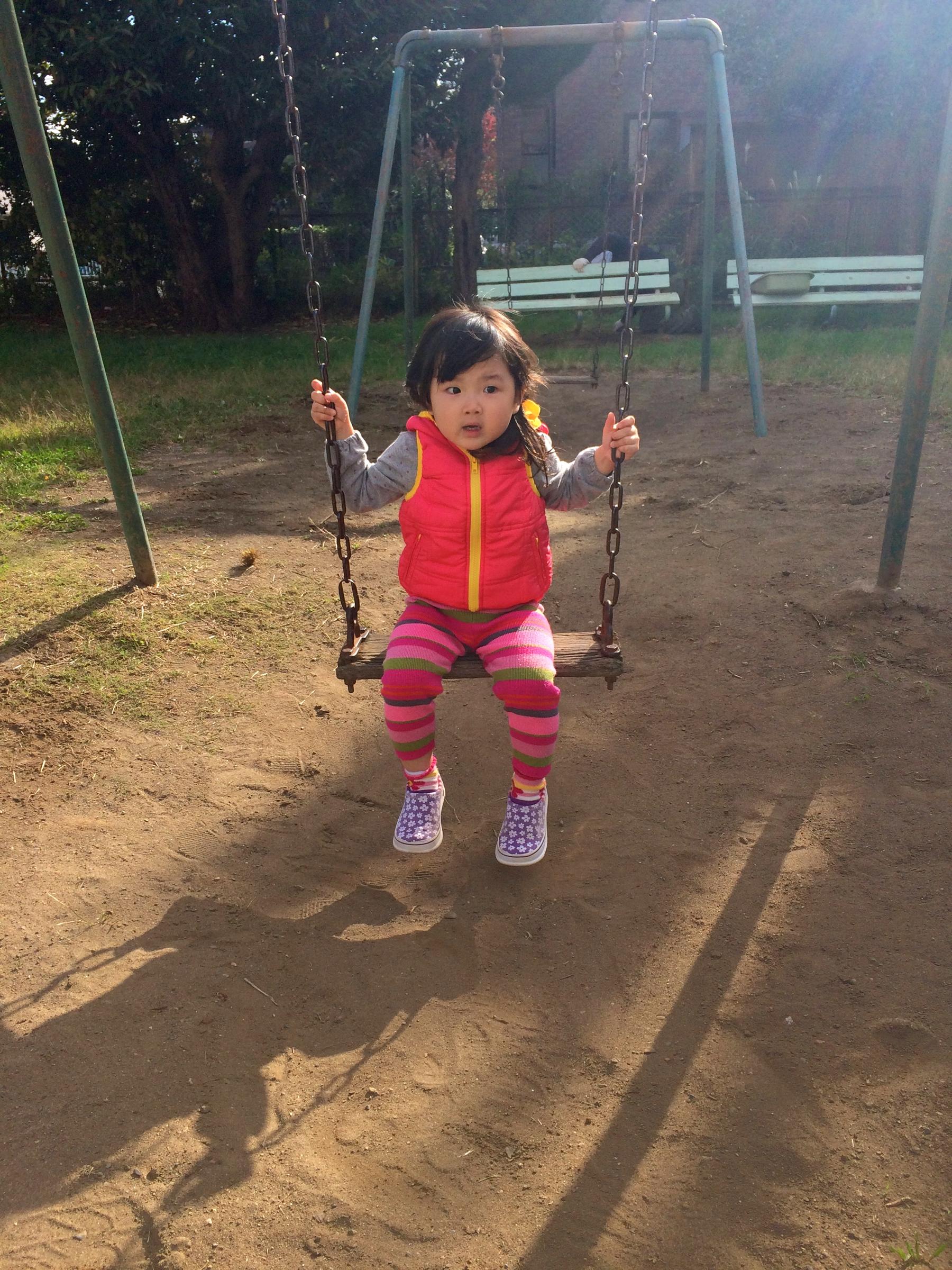まだまだ元気でお昼寝をしそうになく、天気も良かったのでもう一度、公園に行くことにしました。今度はお友達の家の近くの団地公園です。午後はみんな家でお昼寝しているのか、誰もいませんでした。このちゃんの貸し切り状態。まずは、ぶらんこにすべり台。