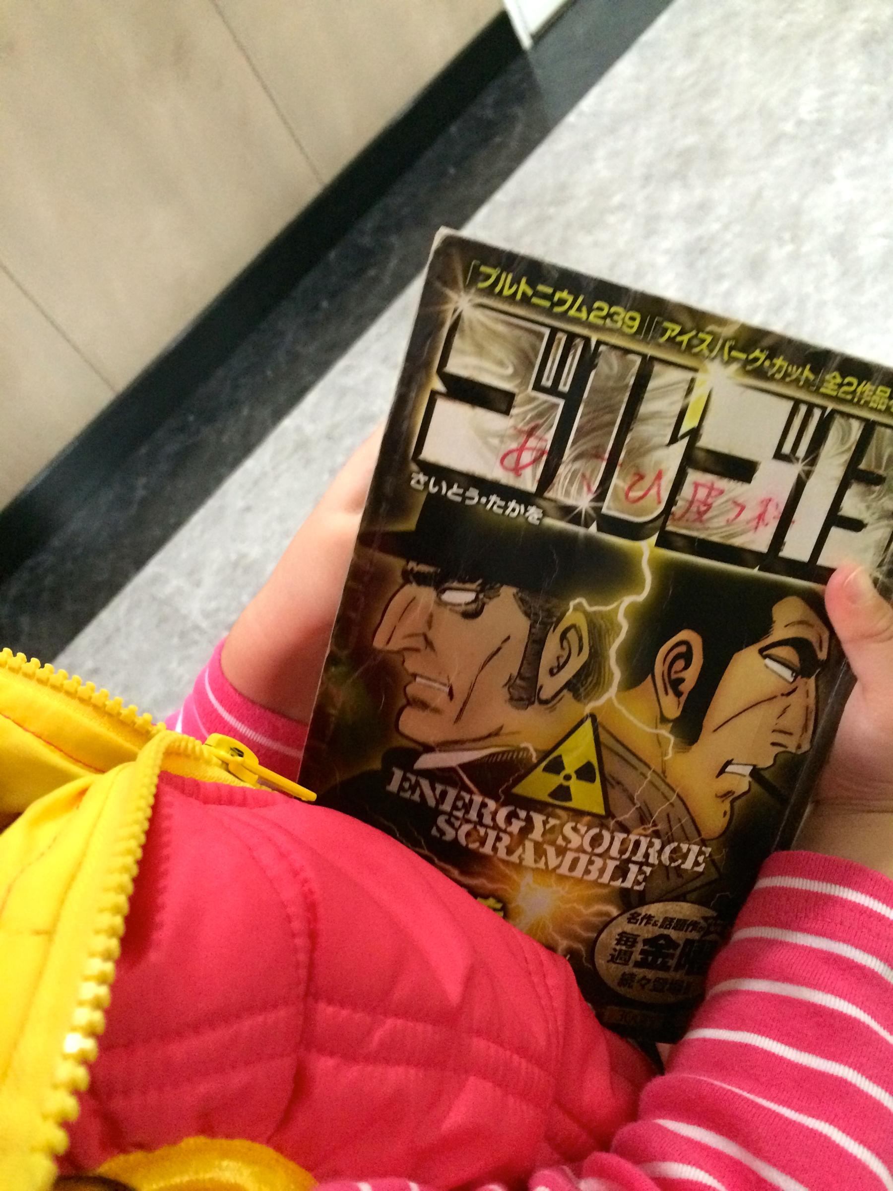 皮膚科と小児科は同じビル、耳鼻科は道路をはさんだ向かいにあるので何とか助かっています。それでも待ち時間が長いため、このちゃんはだんだん飽きてきて機嫌を保つのが毎回大変....皮膚科では本棚からゴルゴ13を選んで持ってきました(笑)しぶい....ペラペラめくっていちおう読んでいました〜