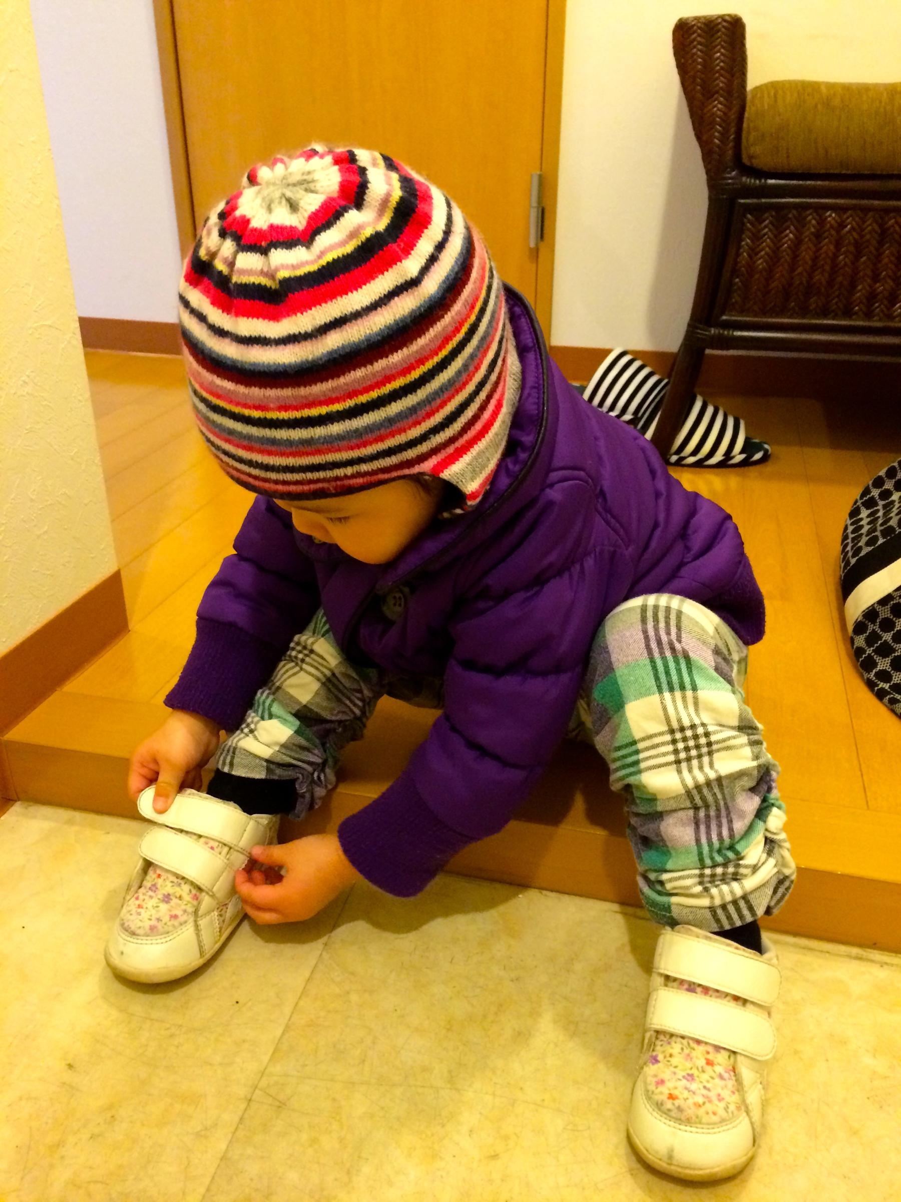 自分で靴を履きたいのでママが少しでも手伝おうとすると全部最初からやり直しになります...なので時間がないときでも辛抱強く見守ることが大事。