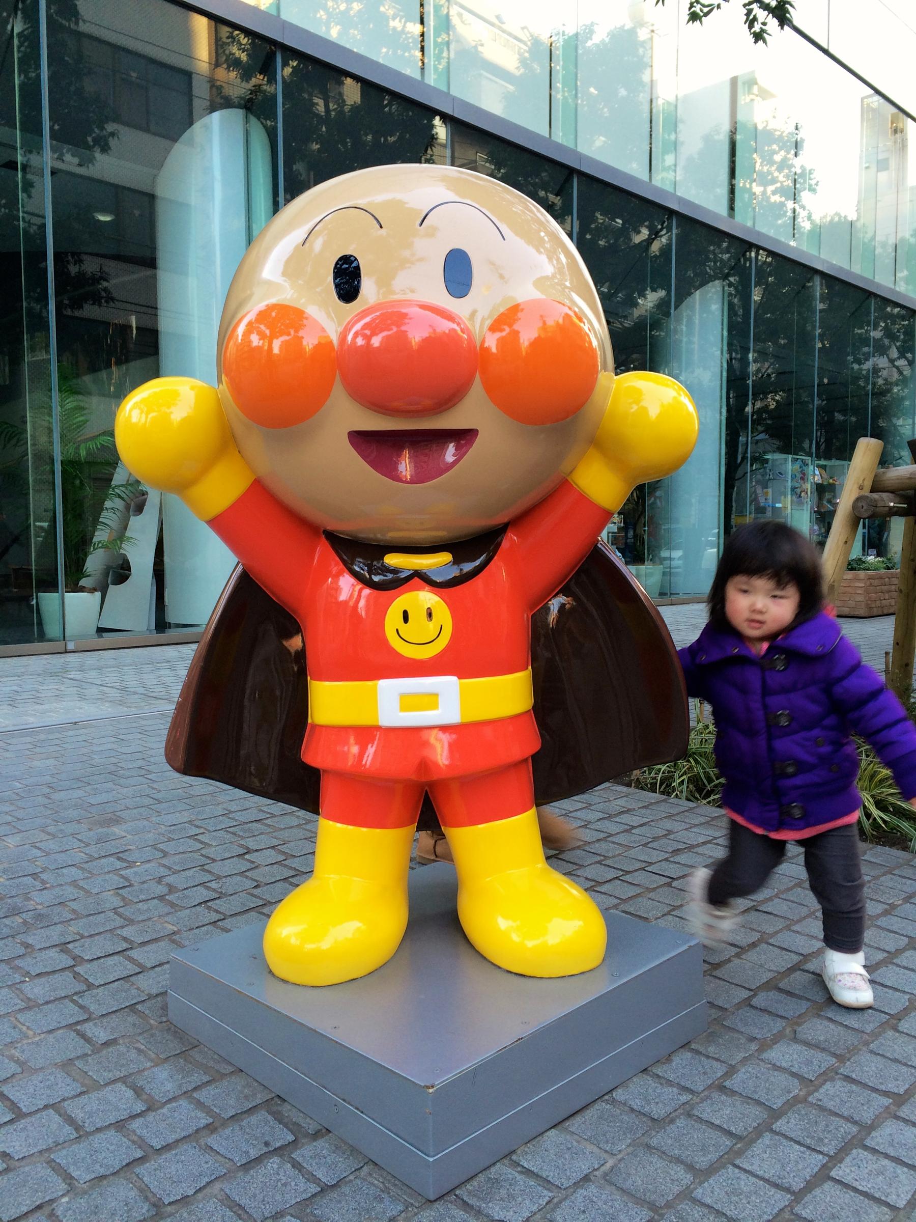 ママの会社の人の家へ遊びに行った帰り、近くにバンダイの本社があって子供が喜ぶよ〜と案内してくれました。このちゃんが大好きなアンパンマ〜ン!