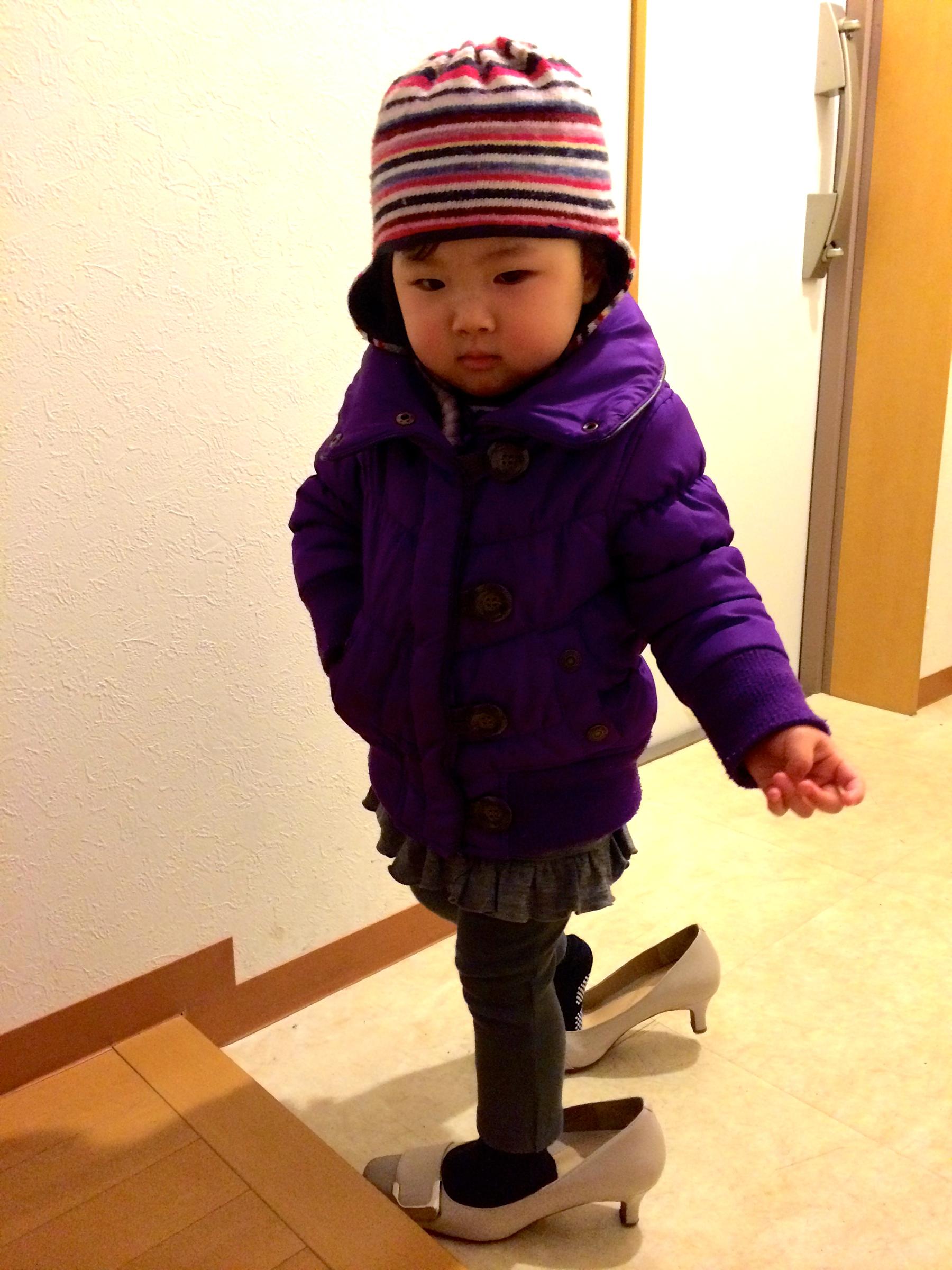 ママの靴を上手に履きこなします。これで歩いたりもしているのでバランス感覚の良さに驚きです。