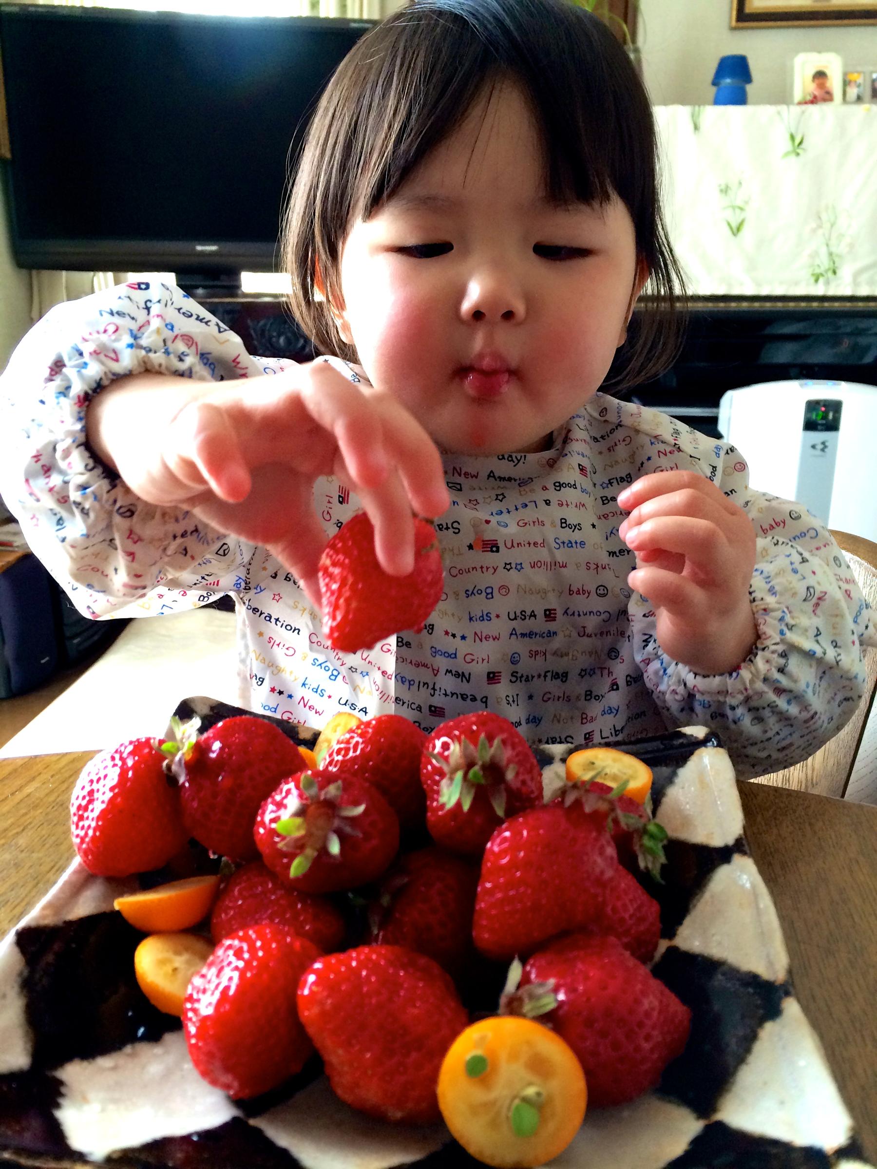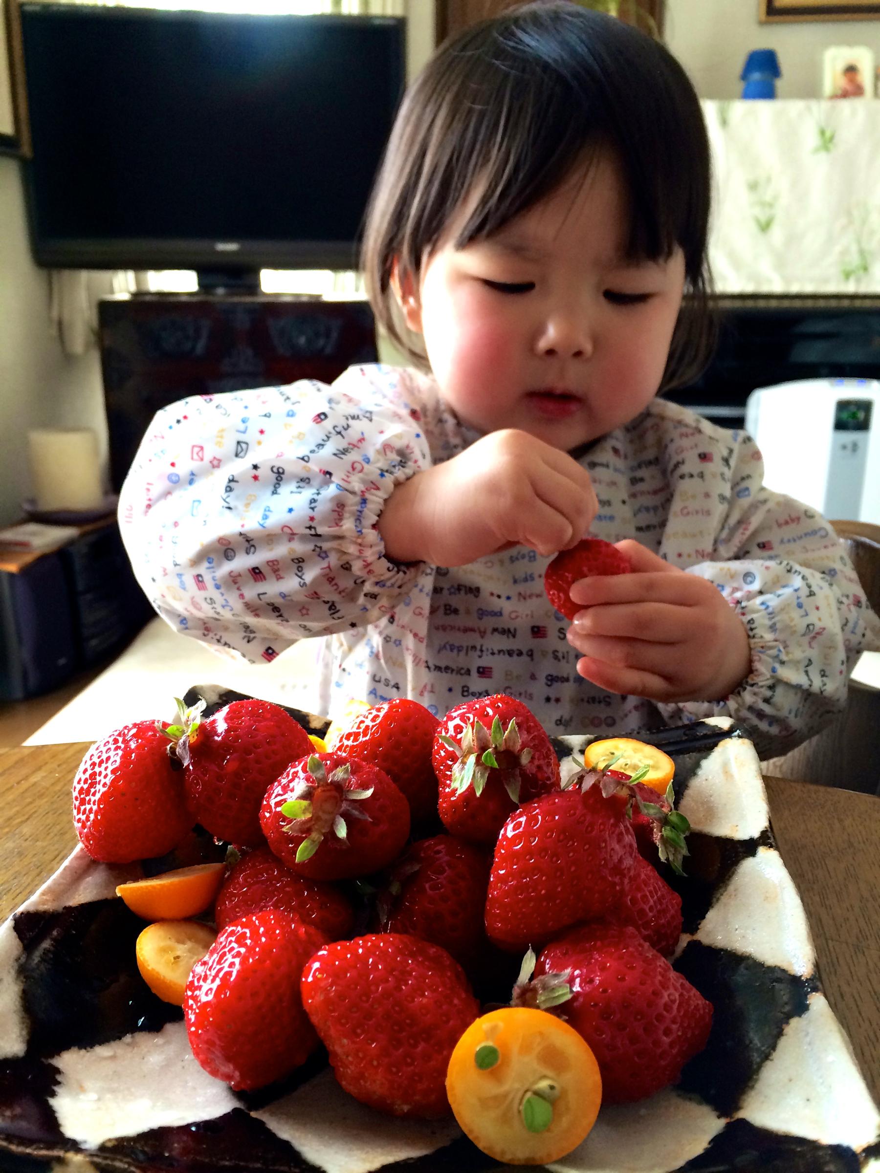 おばあちゃんちに遊びに行ってお昼ごはんのあと、いちごをごちそうになりました。山盛り〜ほおばっているようにみえますが、意外にもキンカンのほうを気に入ったようでパクパク食べていました✨