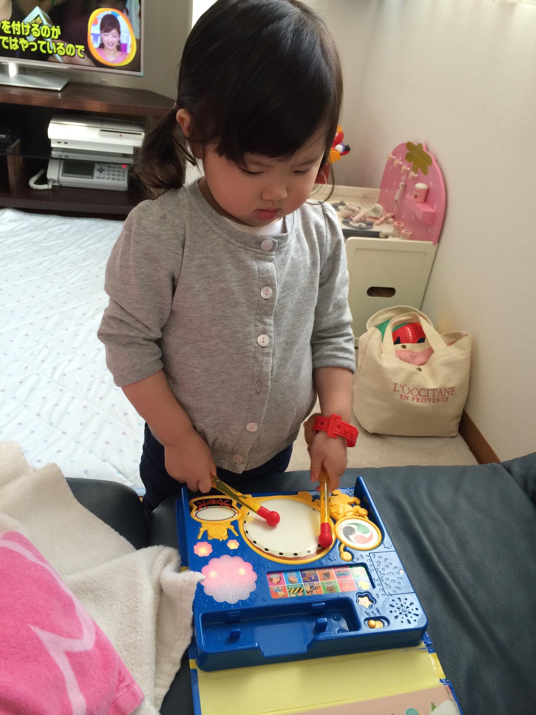 朝ごはんのあとはすぐ「アンパンマンみる〜」だったのに今朝は本棚からたいこの本を取り出して楽しそうにドンドンたたいています。