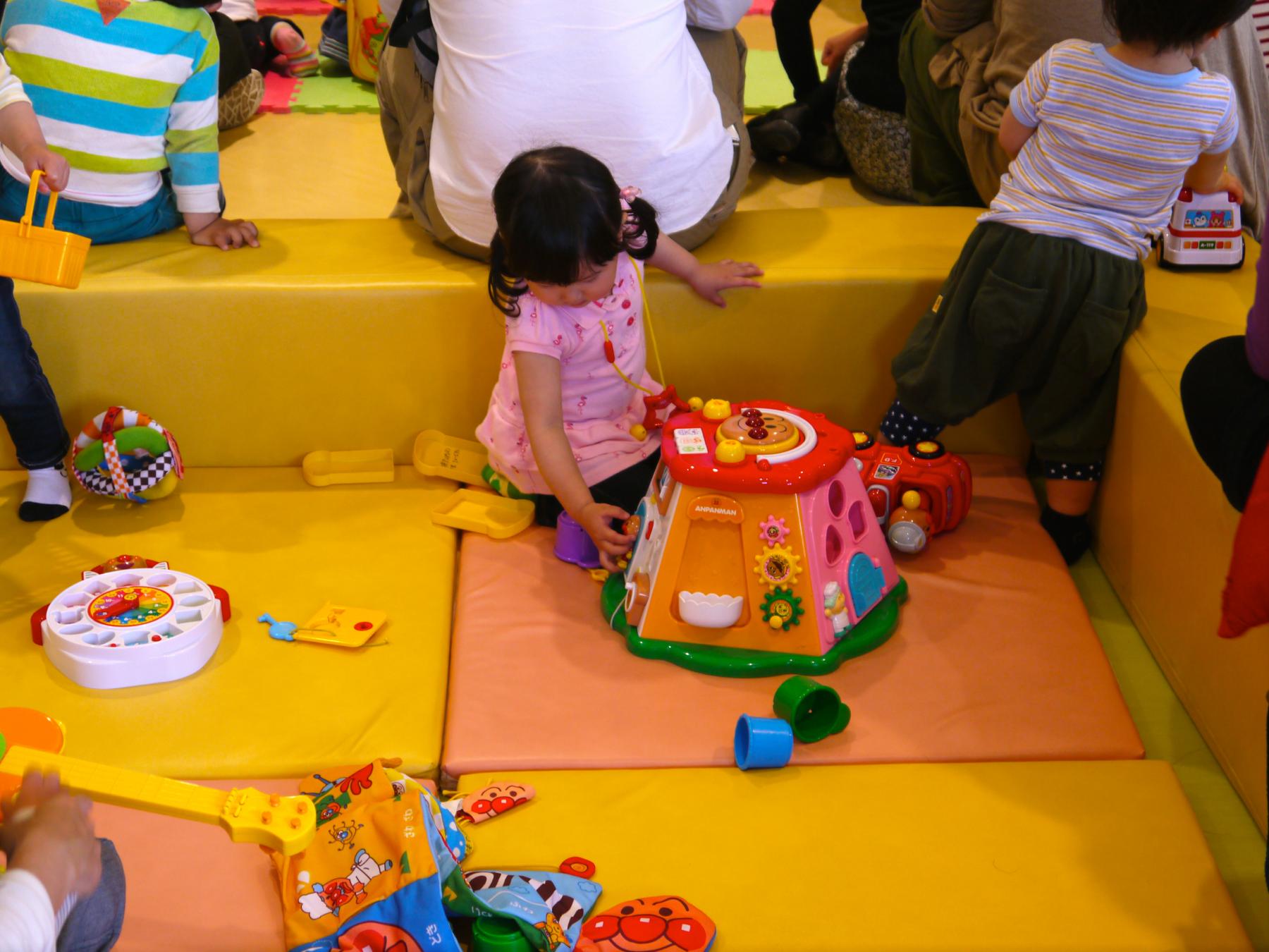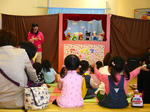 入館するとすぐに2Fで人形劇が始まる時間と教えてもらったので観に行きました。このちゃんは遊ぶスペースに置いてあるおもちゃに夢中で最初は人形劇に背中を向けていたのだけど、音楽や歌が流れると人形劇をやっていることに気付いたようで真剣に観始めていました。