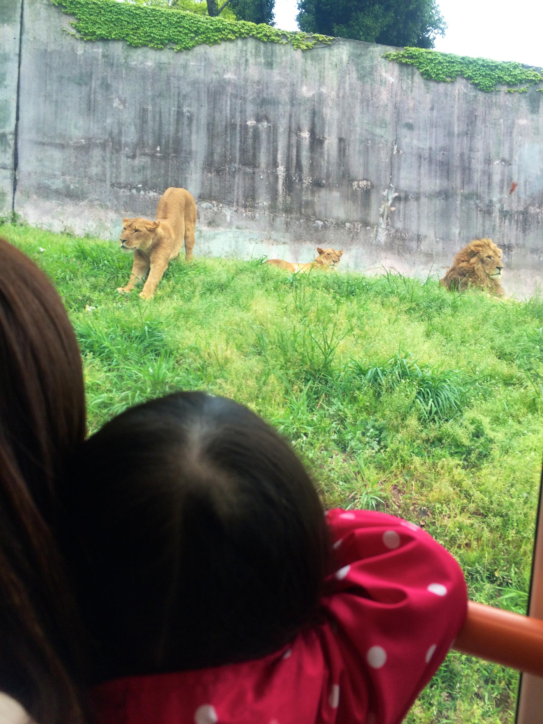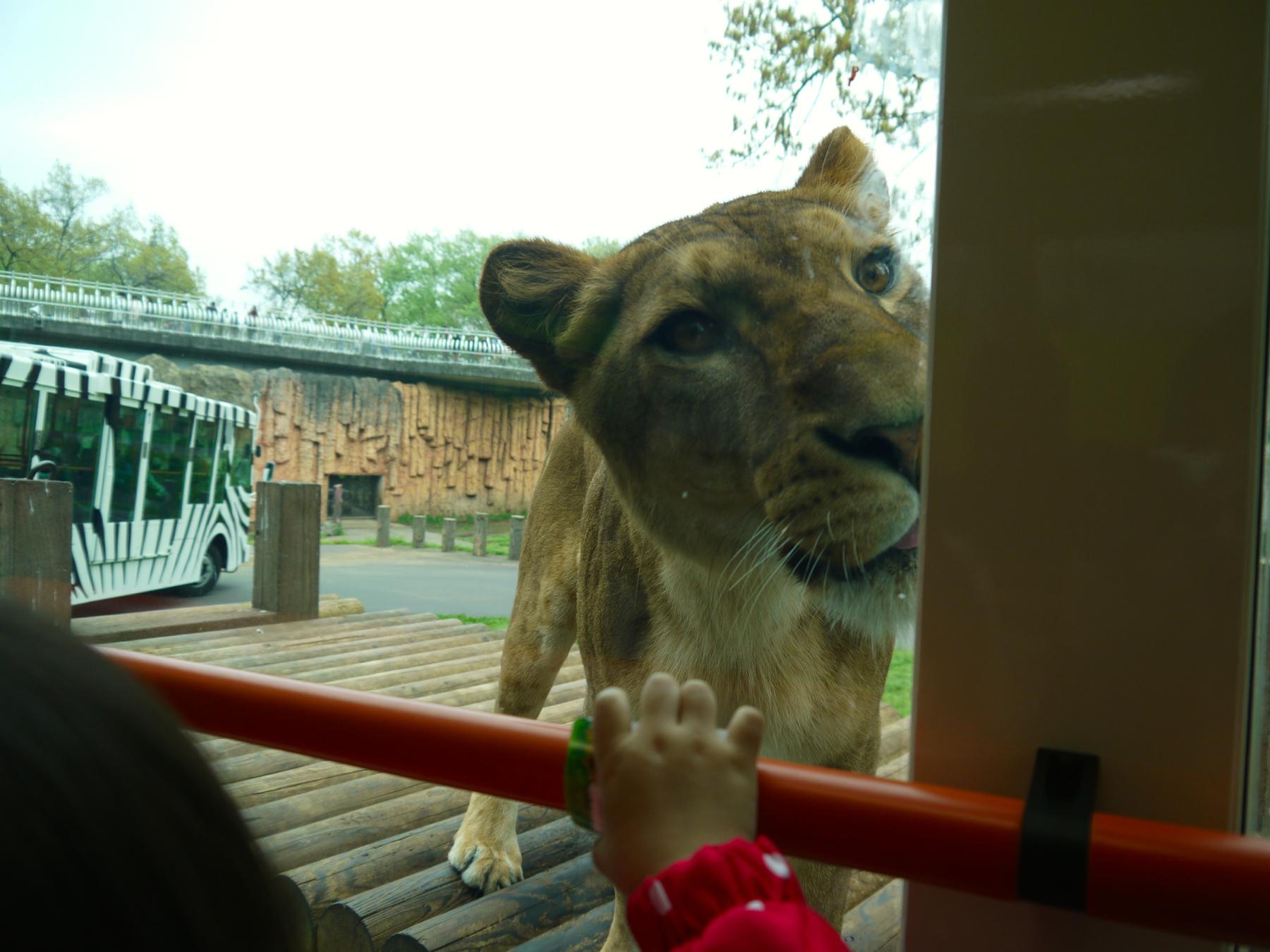 せっかくなのでライオンバスにも乗りました! が、ほとんどのライオンは地面にべた〜っと伸びて昼寝している時間帯でした。それでも何匹かはバスが近づくと寄ってきて、さすがのこのちゃんも顔がこわばって泣きそうになって身を引いていました。