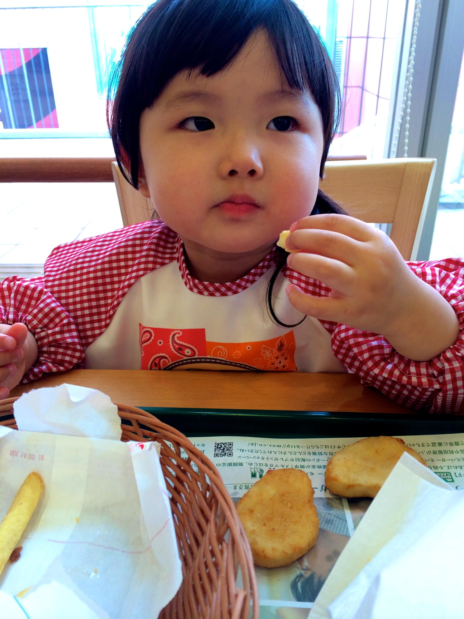 このちゃんはいつもライスバーガーのポーク、ママとシェアでポテトとチキンナゲットを食べました。ママが手を出すと「だめぇ、このちゃんの!」と言いながらポテトをパクパク食べていました。