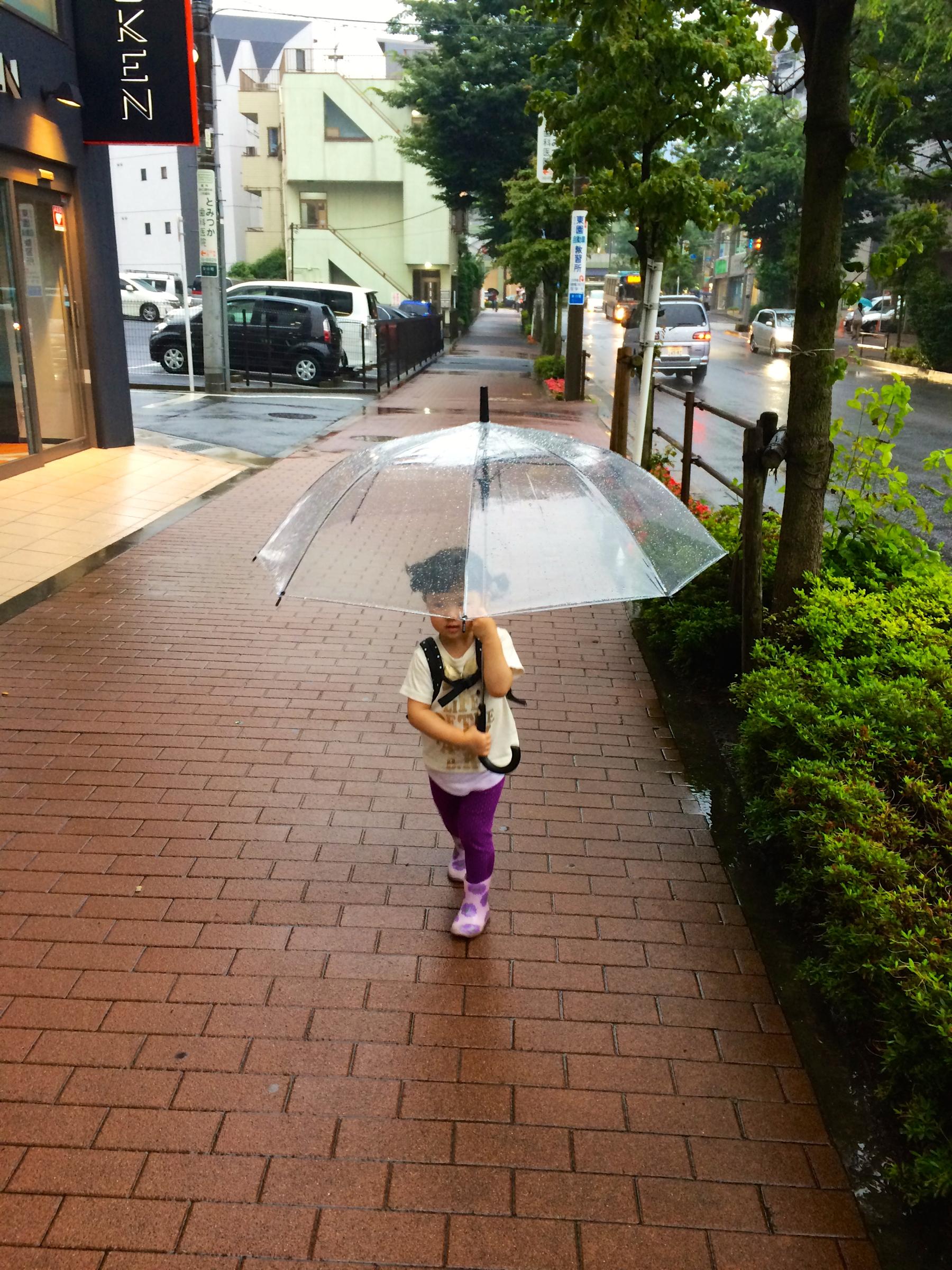 朝、ママが電車に傘を忘れてきてしまったので帰りにトモズで傘を買いました。二人でさそうと思ったのに自分がさすと言って聞かないこのちゃん。一緒にいた同じクラスの女の子のママが「どうぞ」と言ってママの分の傘をくれました。