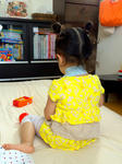 冷えピタを貼ってリビングにお布団を引いて大人しく遊んでいます。