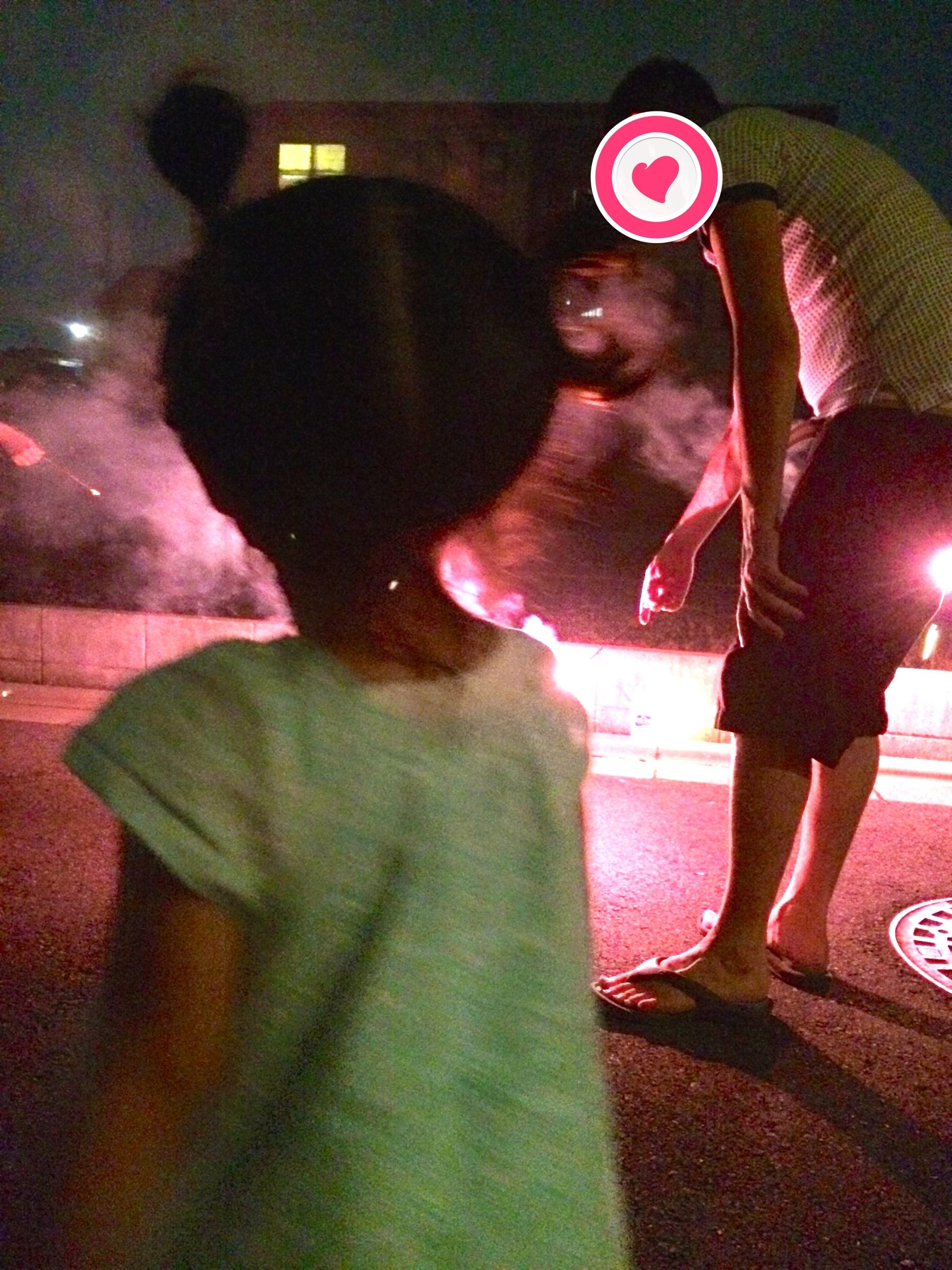 近所のお友達とみんなで花火をしました。手持ち花火は今回が初めてです。線香花火が気に入ったみたいです。でも、走り回るほうが楽しかったみたいで広いスペースを行ったり来たりしていました。近くで打ち上げ花火も上がっていたので両方楽しむことができました。