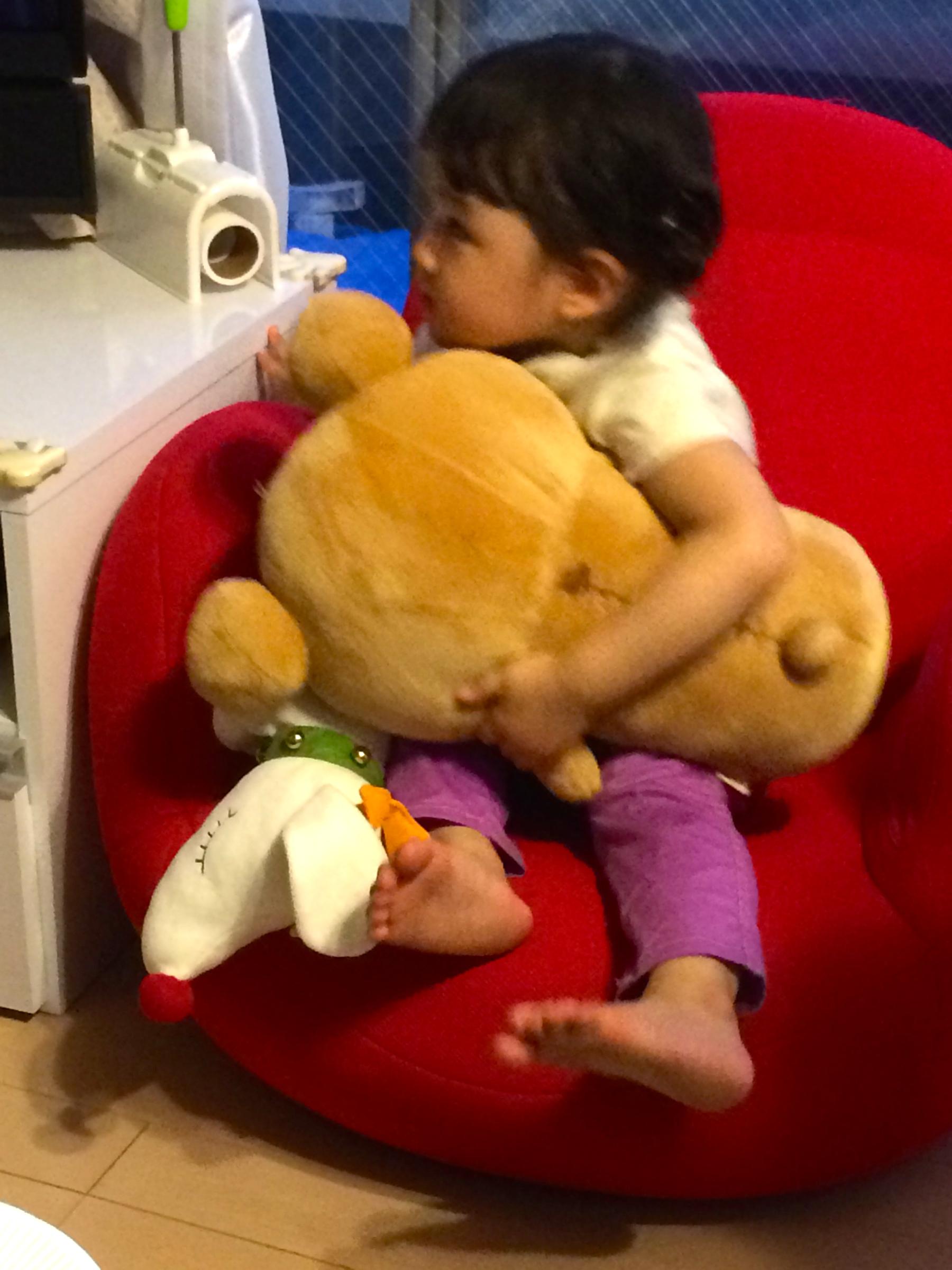 お姉ちゃんのリラックマを貸してもらって抱え込むこのちゃん。