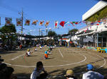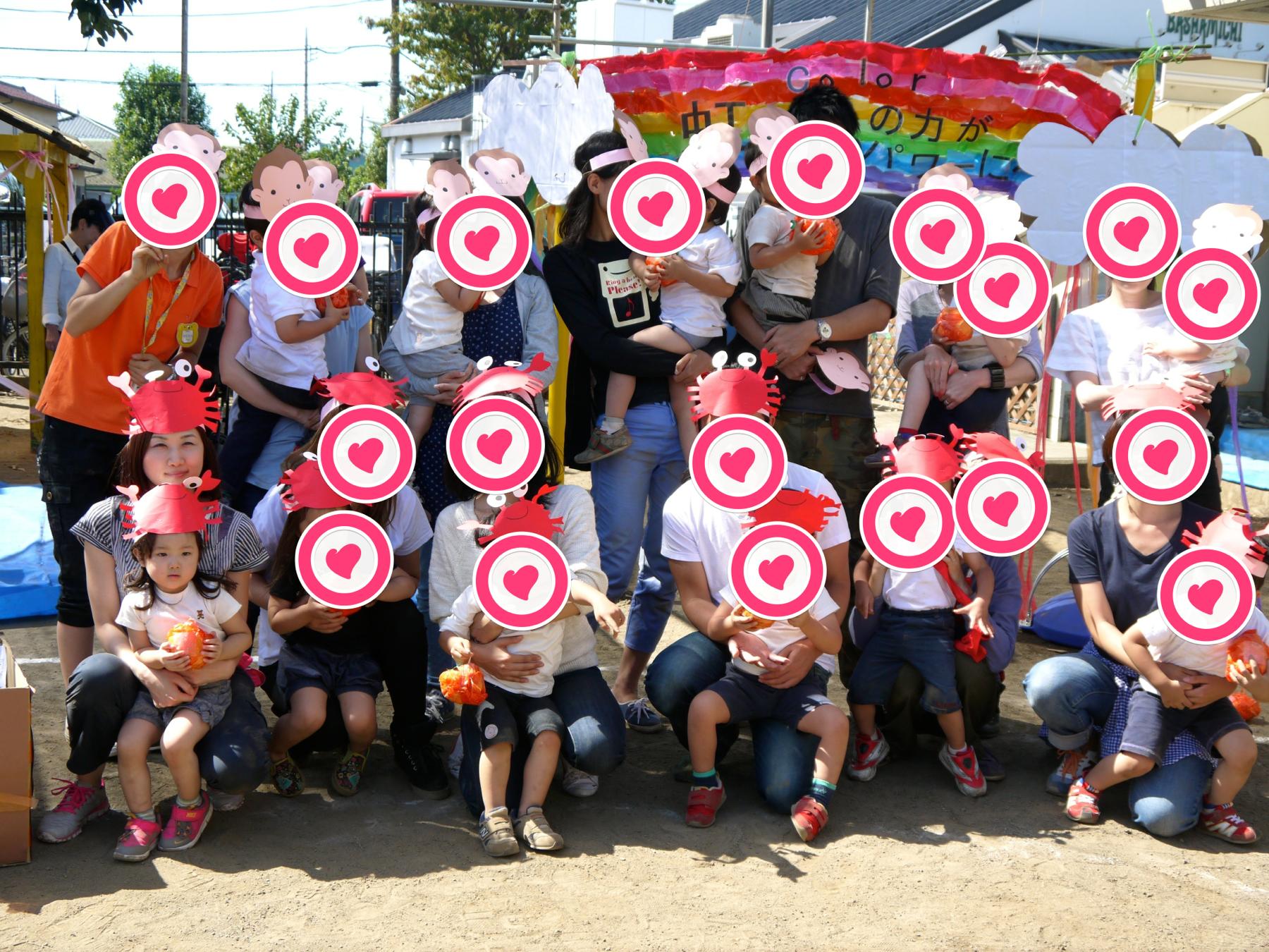 親子競技ではサルとカニチームに分かれて、柿を取ってかごに入れてどちらのチームが早くゴールできるかを競いました。カニチームの勝利!最後はみんなで記念撮影をしました。