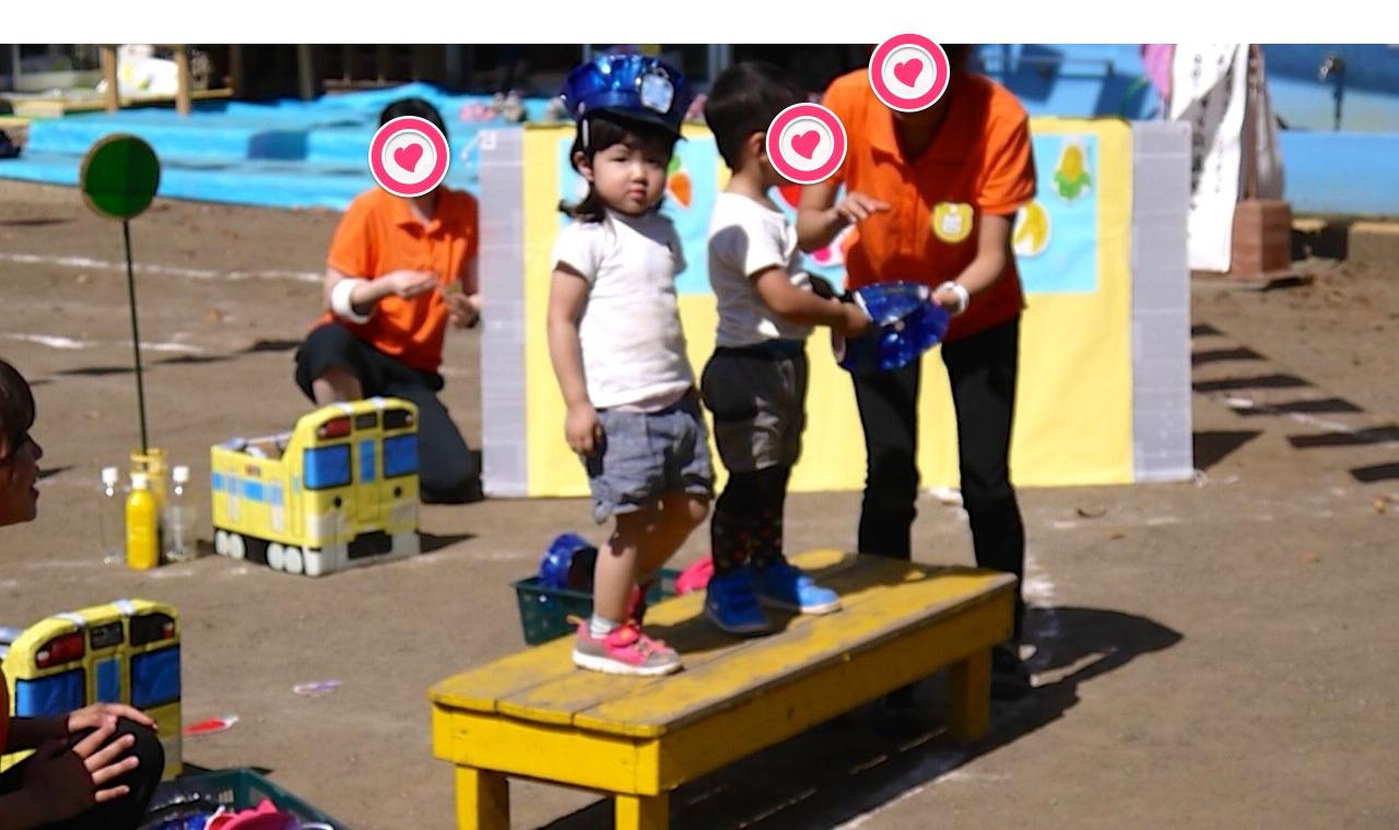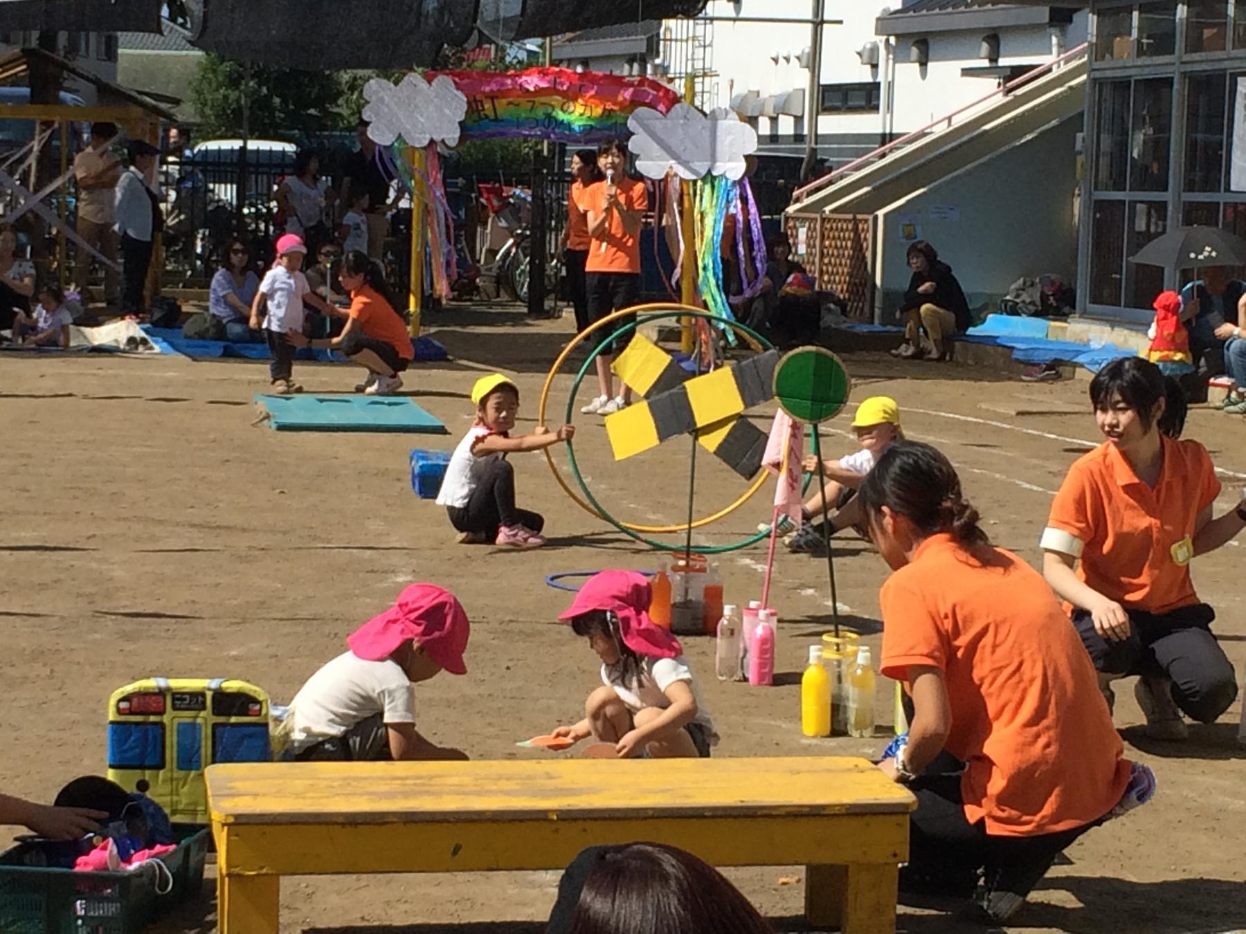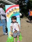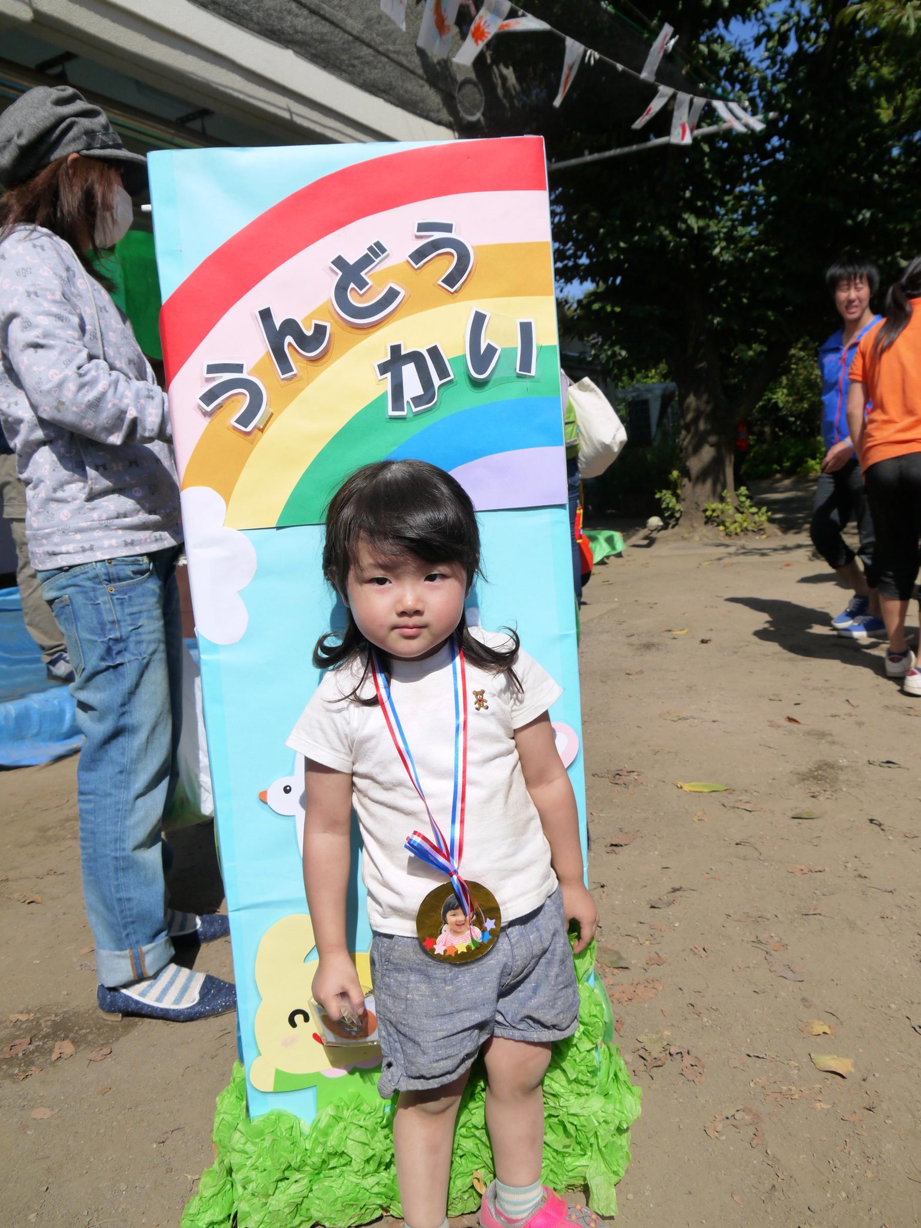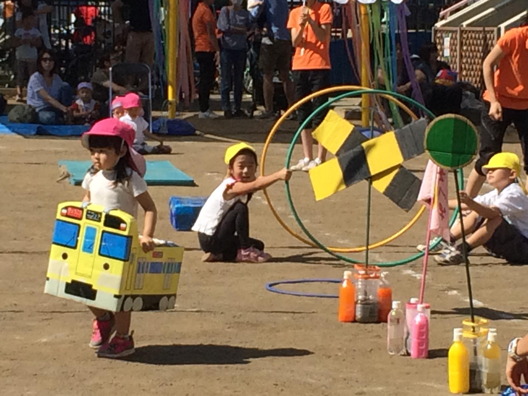 今年はまずマットででんぐり返しをし、電車に乗ってフラフープをくぐり、ジグザグに走ったら最後は半分に切られた自分のマーク(このちゃんはみかん)を探して先生に渡してゴールすると車掌さんの帽子がもらえて、最後に「ハイポーズ、ピッ」と保護者席に向かってポーズをするという何ともかわいらしい競技でした。