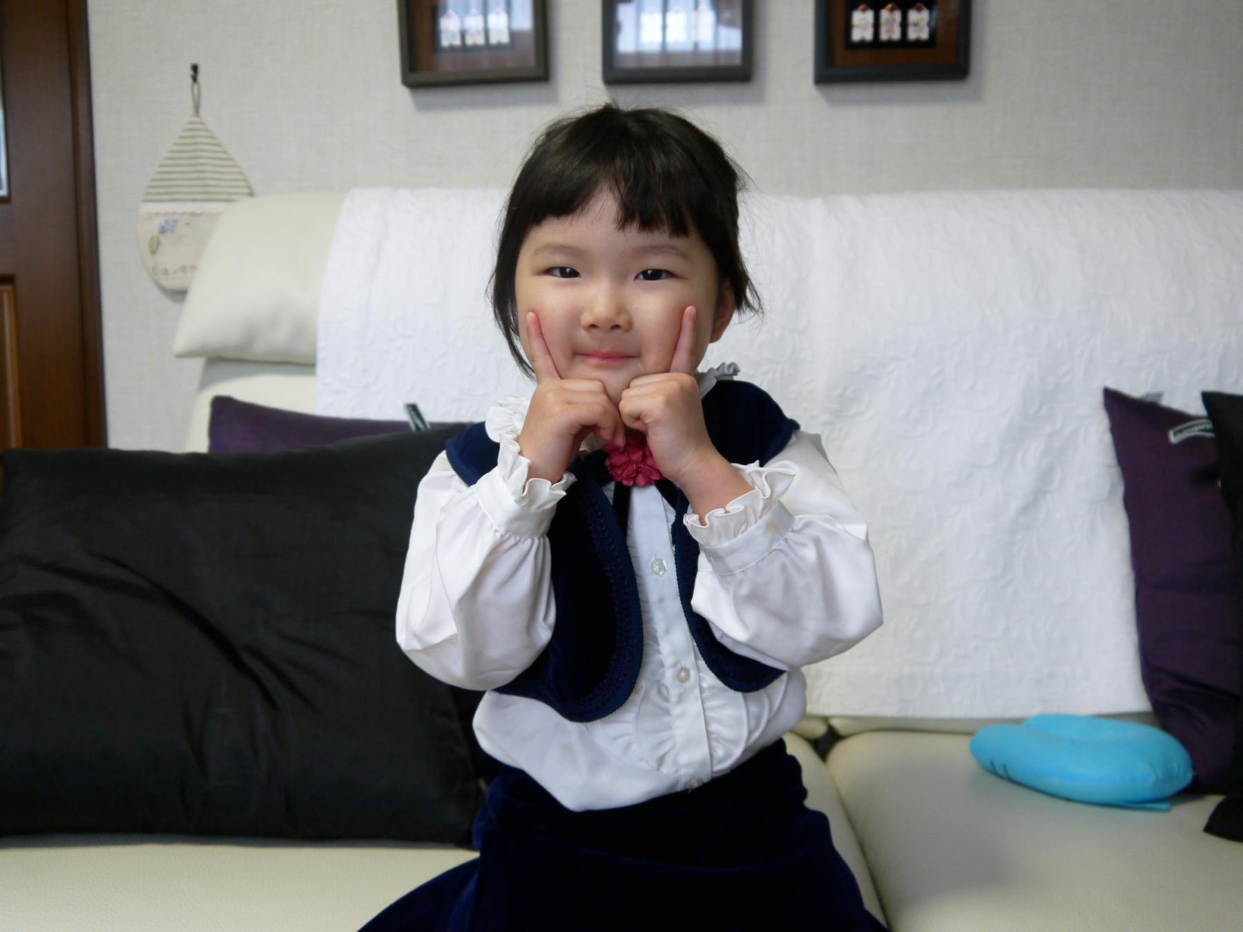 ママが小さいときに叔父さんの結婚式で着た洋服をこのちゃんが着てみました。どうやら昨日、おばあちゃんとドレスの話をしたらしく着てみる気になったようです。