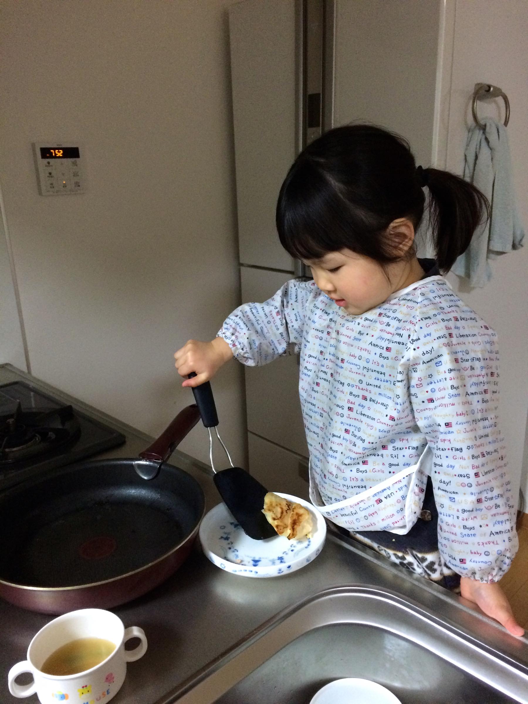夕ごはんに餃子を作りました。餃子が大好きなこのちゃんはおかわりを「このちゃんがやる〜」といってキッチンに椅子を運びこみ、フライ返しを上手につかってお皿に餃子をよそっていました。