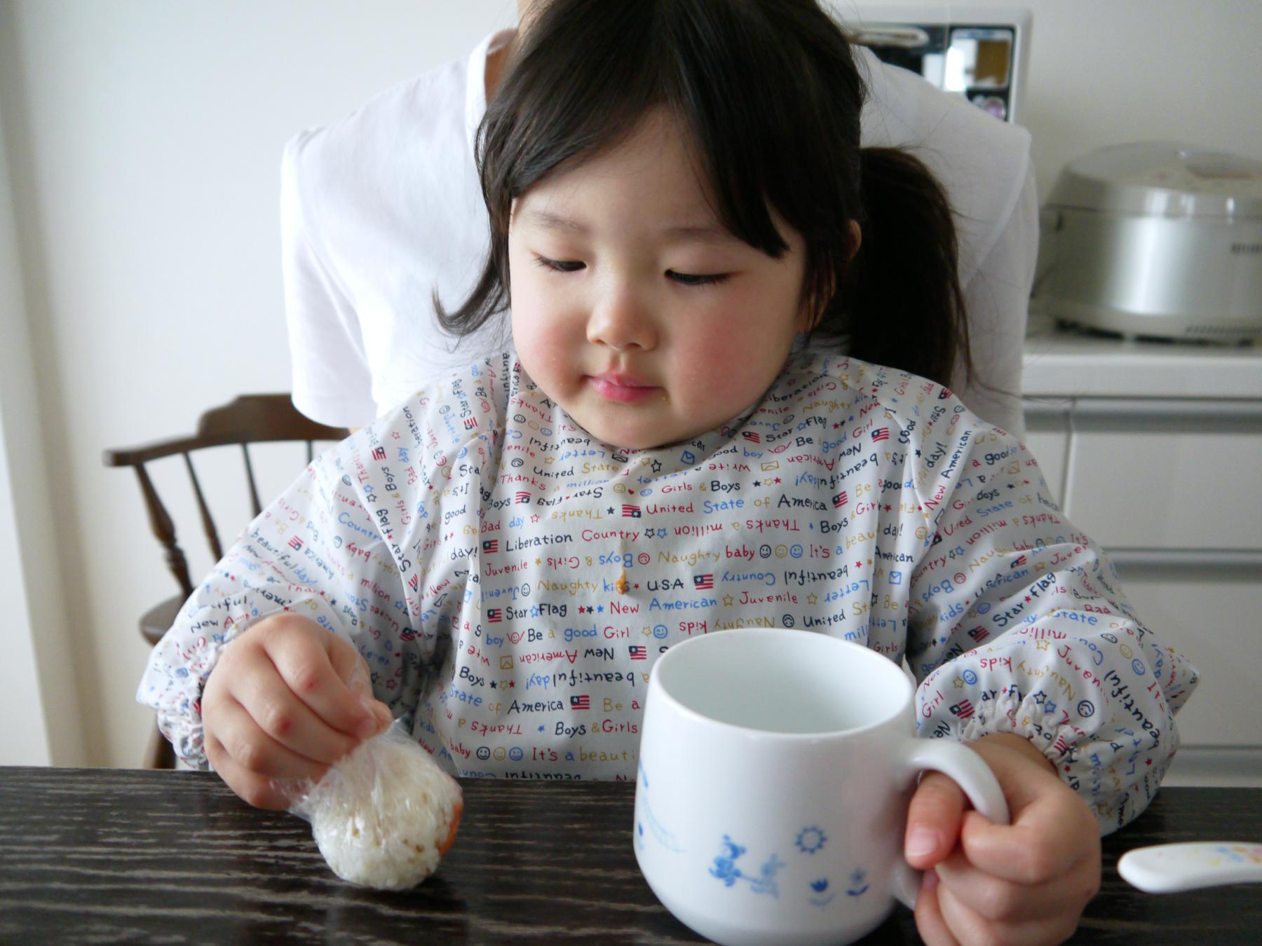 このちゃんはしゃけおにぎりと唐揚げ、ポテトをパクパク食べていました〜
