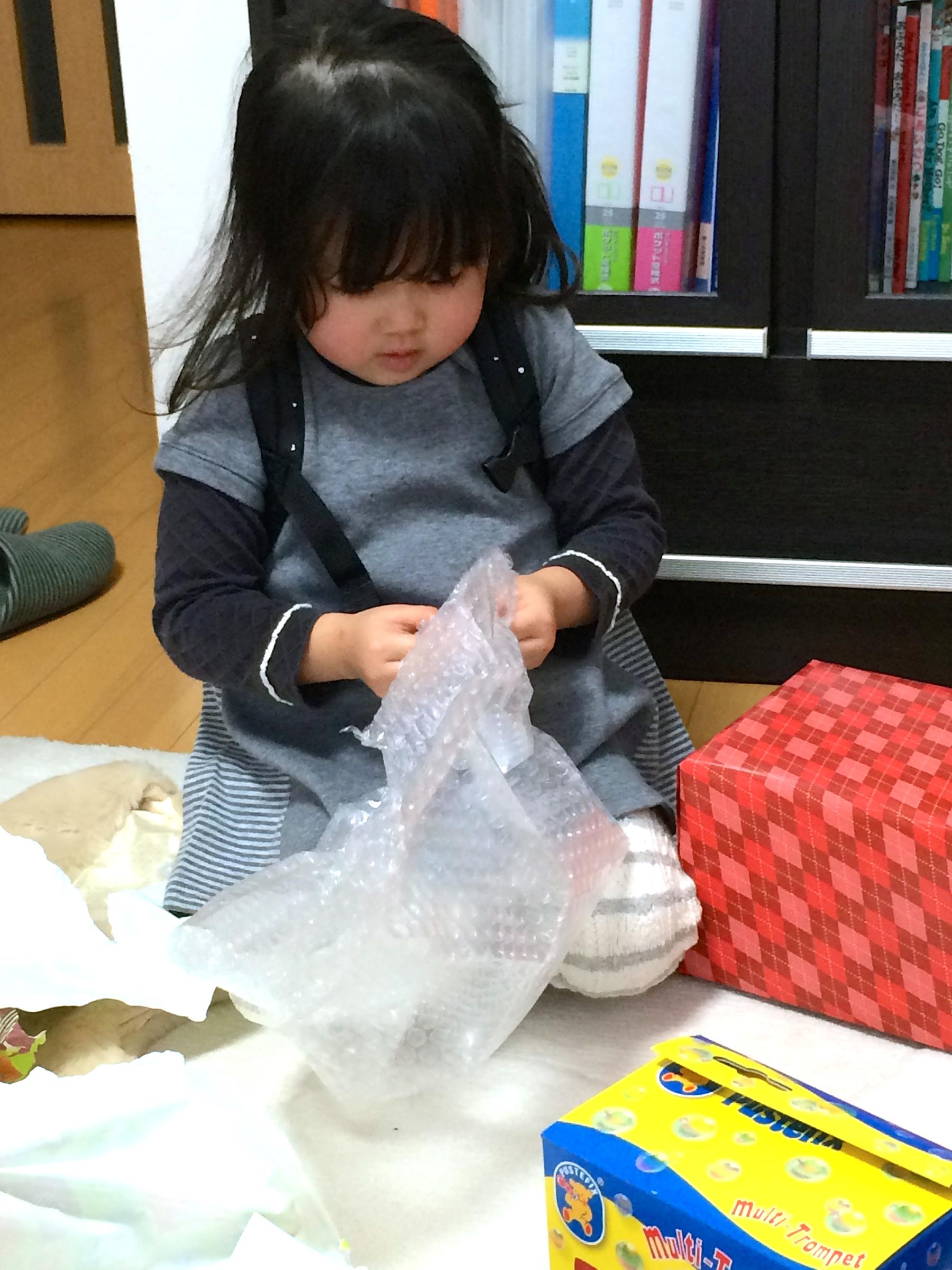 プレゼントを開けるこのちゃん。祖母からは洋服、ママからはシャボン玉とプーさんのホットサンドメーカー、最後にパパからのプレゼントを開けたこのちゃんは大興奮!「アンパンマンだ〜!!!」テンションが一気に高くなり、他のプレゼントは目に入らないぐらい夢中になってアンパンマンのタブレット遊び始めました。アンパンマン強し...