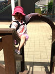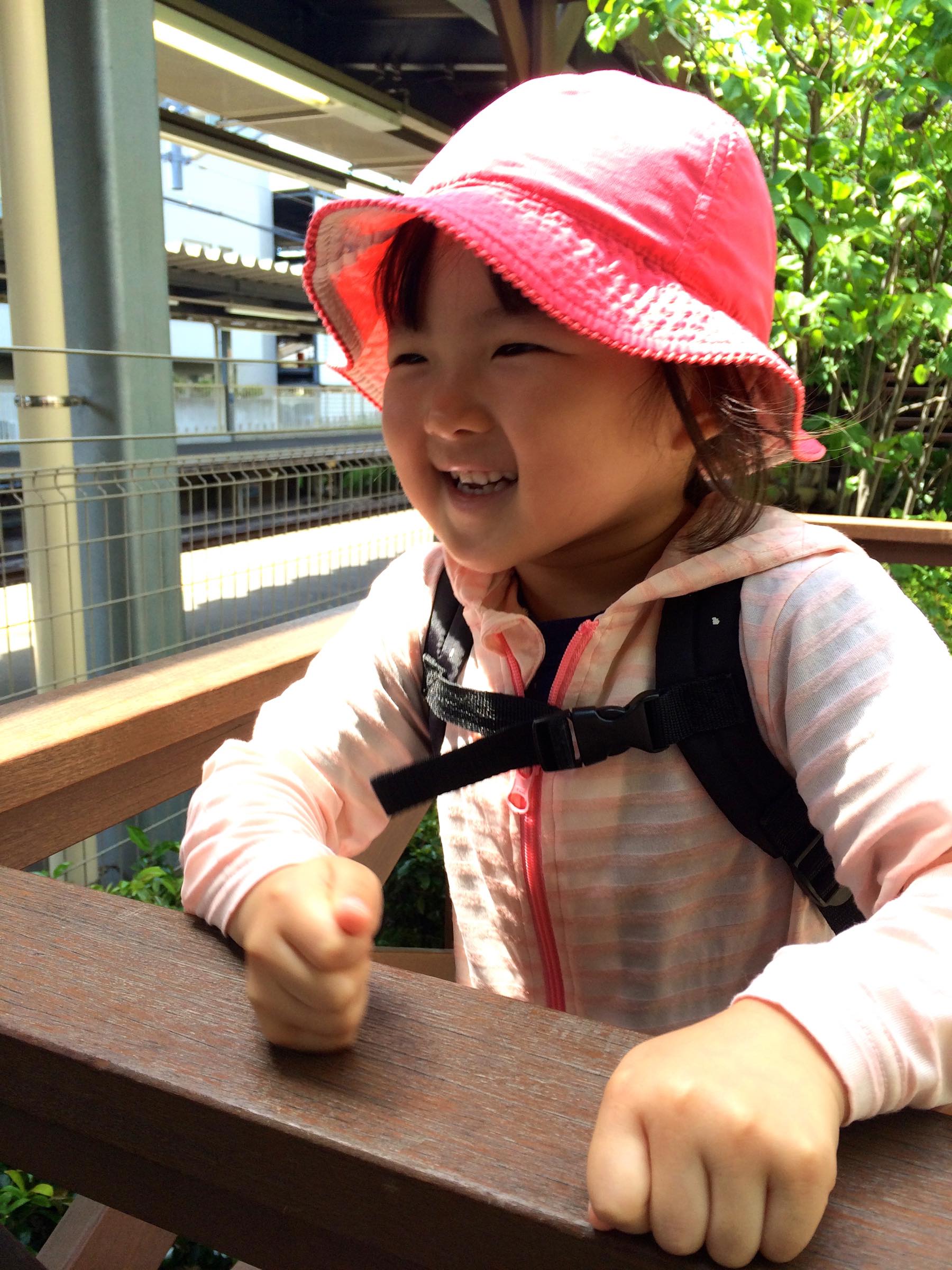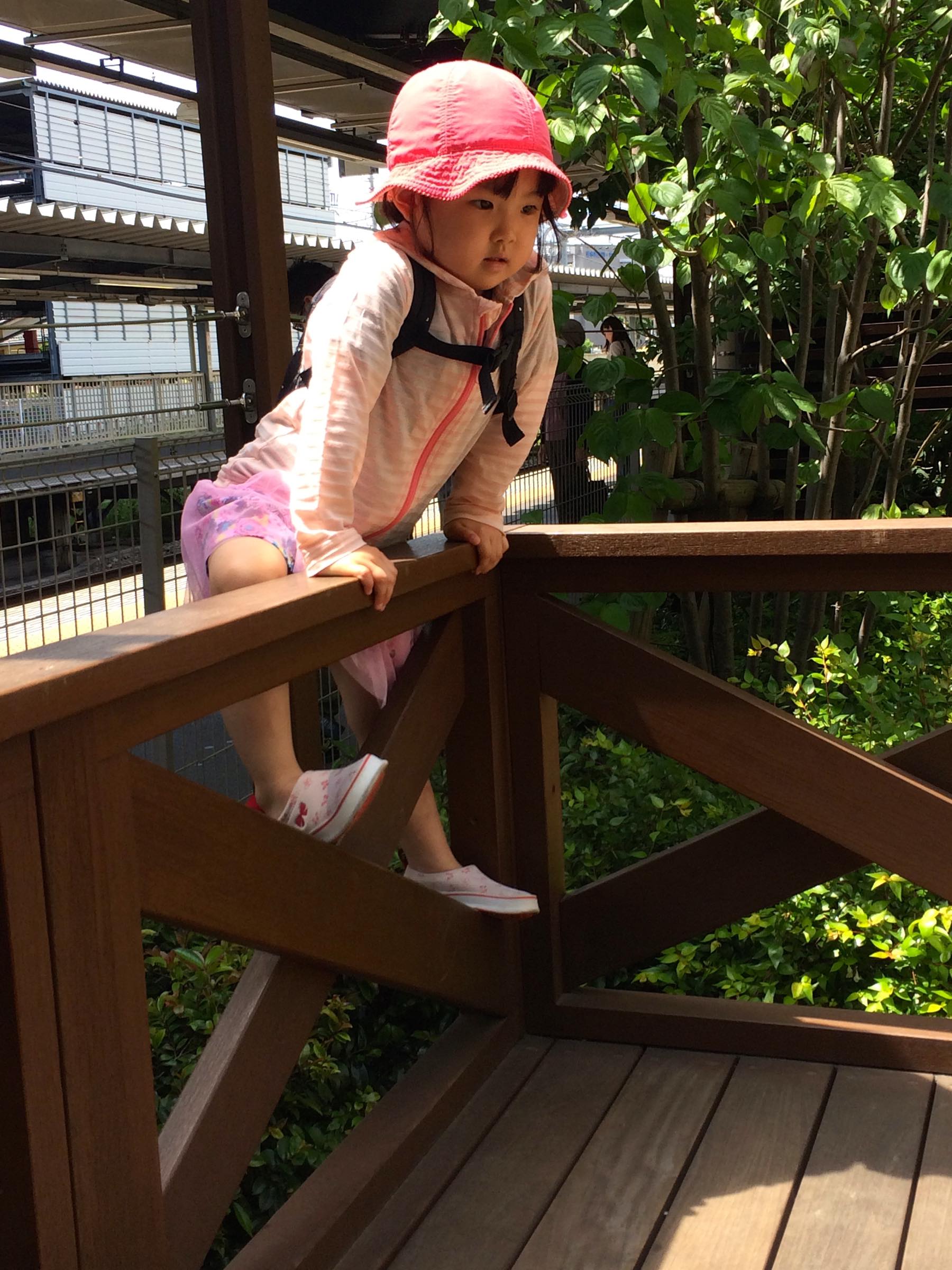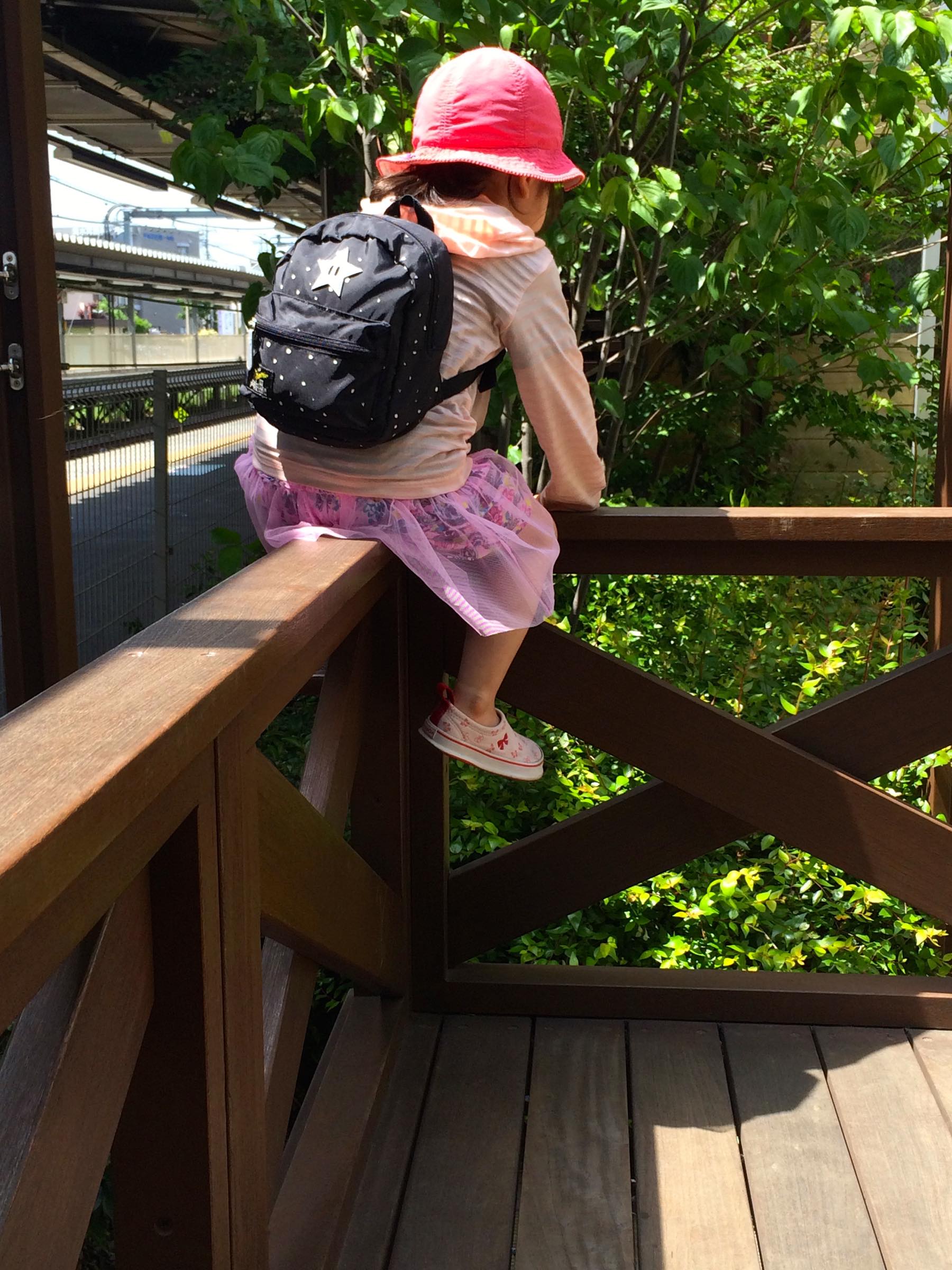 ここは電車がみえるテラスで、1歳児クラスのころから大好きな場所で週末もよく立ち寄っています。電車をみているよりよじ登っているほうが多い気もするけど...