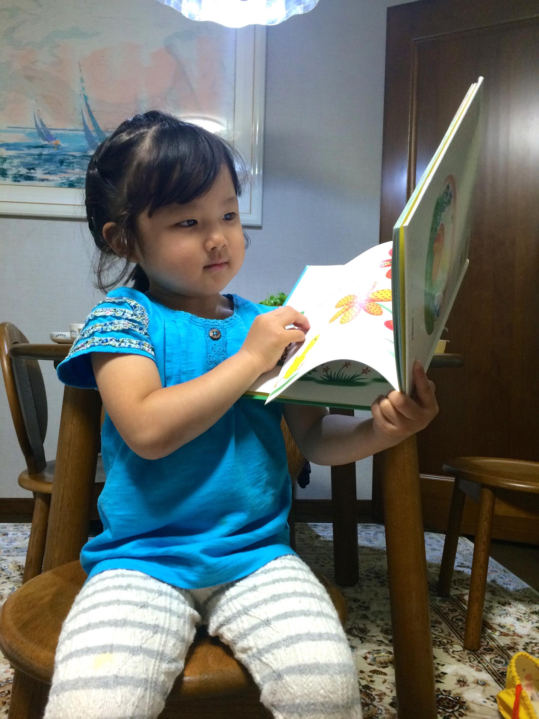 食後には絵本の読み聞かせが始まりました〜まだ字はほとんど読めないので絵を見ながらオリジナルの話を聞かせてくれます。先生の真似をして、こちらに絵が見えるように本を持って読んでくれます。おしゃべりをしていると厳しく注意されます(笑) 保育園での様子が忠実に再現されていておばあちゃんと二人で笑ってしまいます。