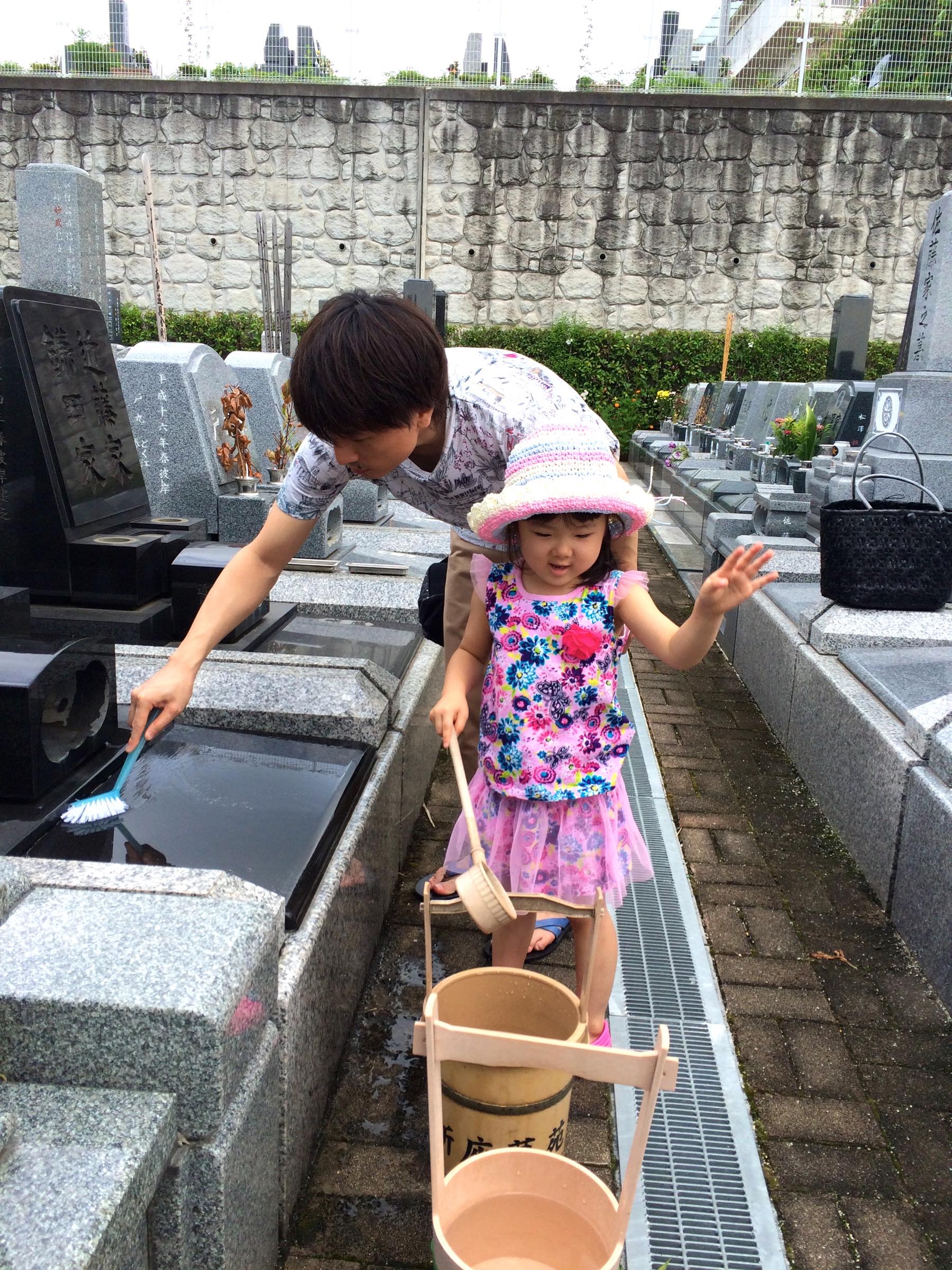今日はおじいちゃんのお墓参りに行ってきました。墓石のお掃除のとき水をまきたがるこのちゃん。どうやら水遊びできると思ったようで...暑い日だったから気持ちはわかるけど...お掃除するんだよ、と教えてみんなで汚れを落としてきれいにしました。