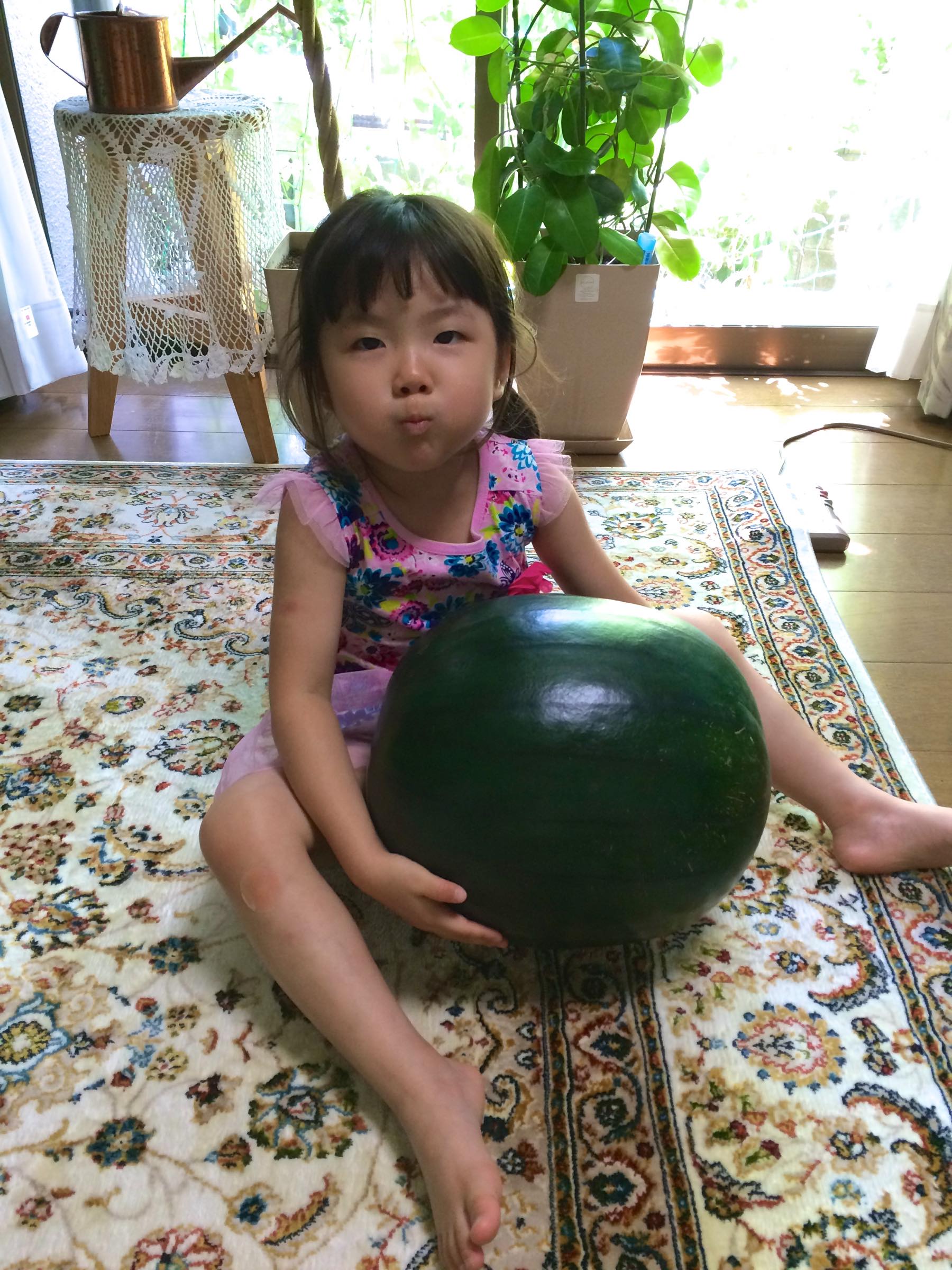 おばあちゃんちに戻ってからは届いていたスイカの箱をみんなで開けました。すご〜い!とても大きくて切り分けるのも大変そうでした