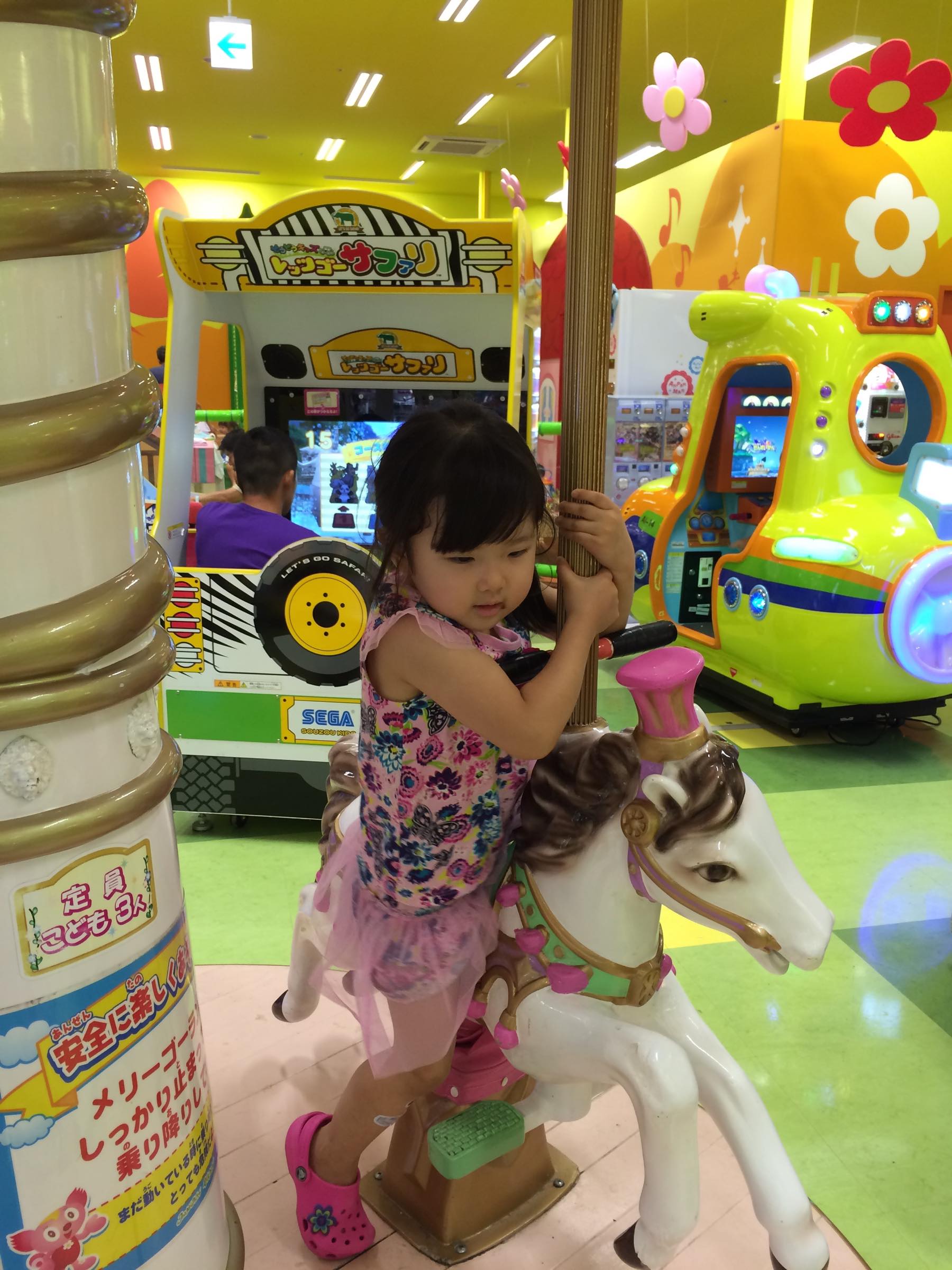 イオンに買い物に行ってきました。ゲームコーナーをスルーすることはできず...しっかりメリーゴーランドに乗ったこのちゃんでした。ツムツムのゲームを発見し、パパももれなく楽しんでいました♪