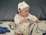 カバーオールに手が隠れてたし、帽子もぶかぶかだったのに