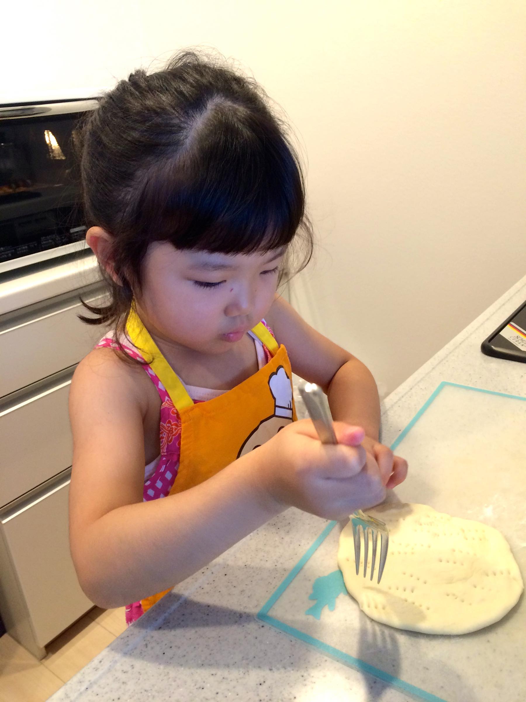 ホームベーカリーで捏ねた生地を成形し、フォークで穴を開けました。