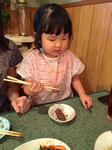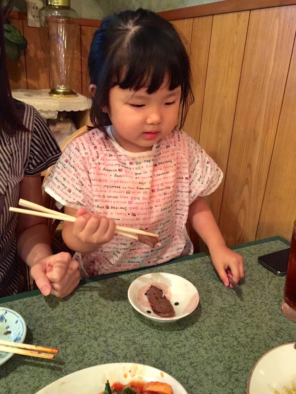 みんなでウーロン茶で乾杯!お肉は小さく切らなくてもそのままお箸で食べることができて、この1年で樹花も成長したものです。夜の外食はほぼしたことがないのでちょっとテンションが高めで、お肉とごはんをモリモリ食べお店を出てからもずっと元気一杯でした。