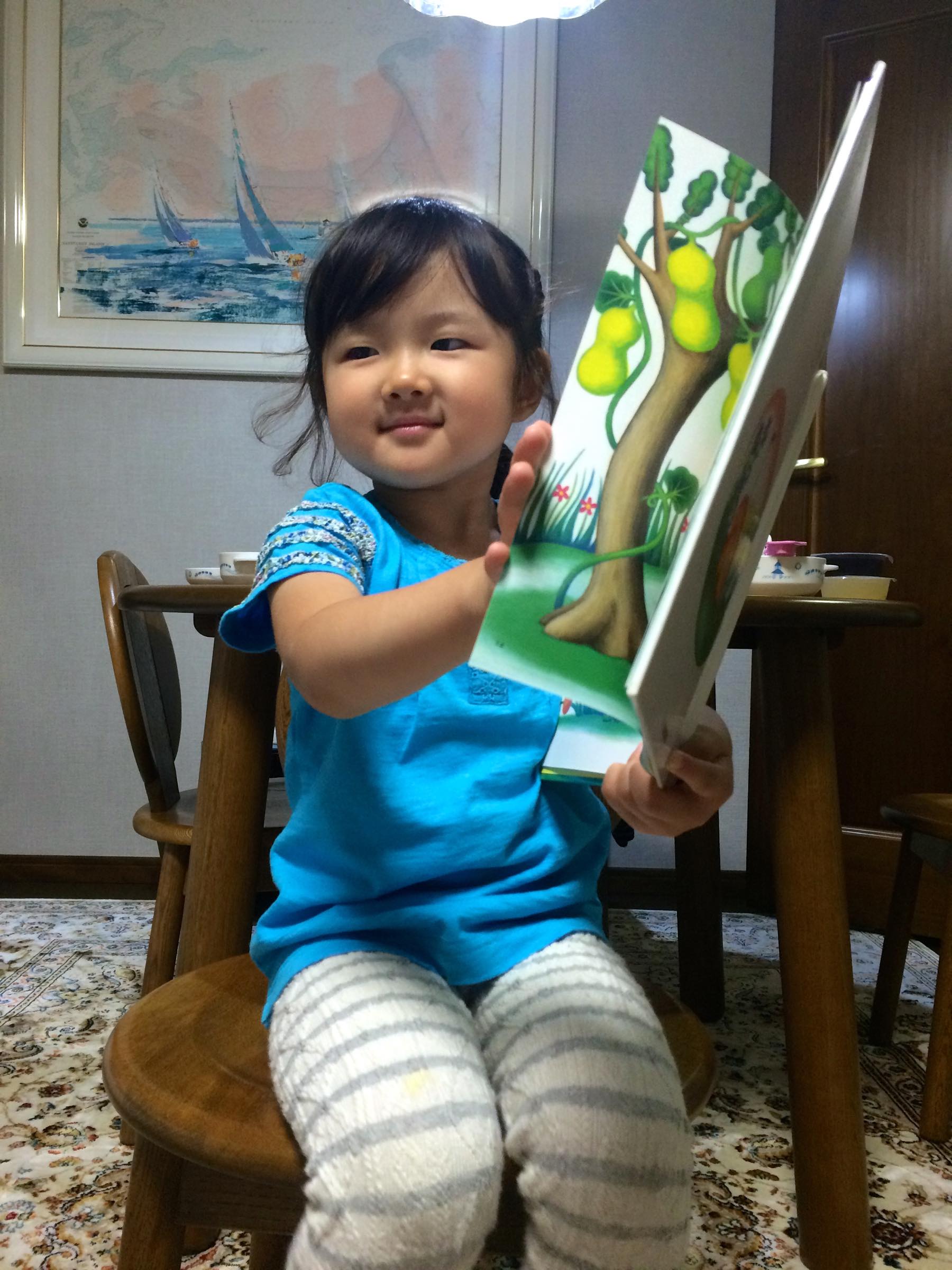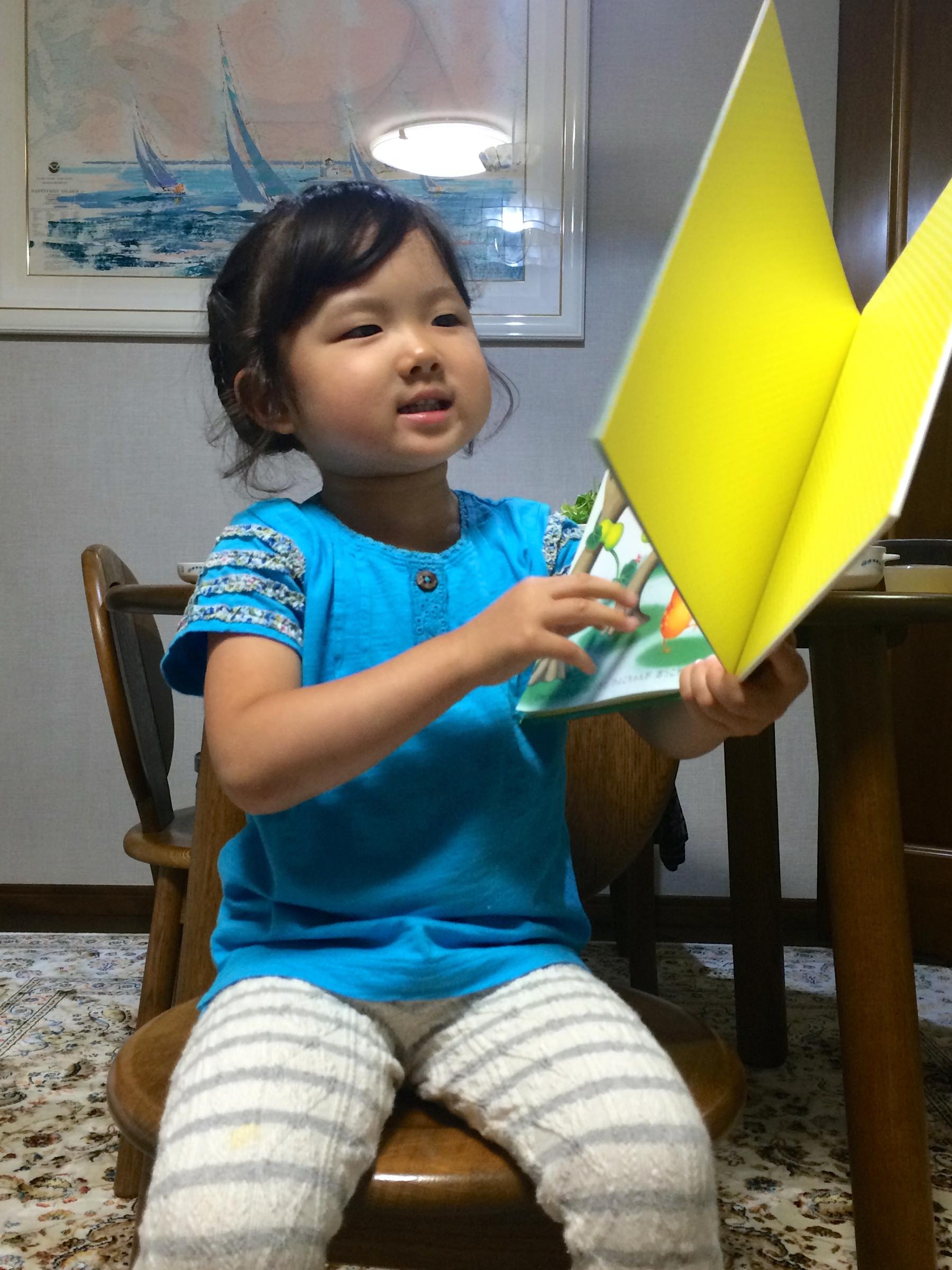 食後には絵本の読み聞かせが始まりました〜まだ字はほとんど読めないので絵を見ながらオリジナルの話を聞かせてくれます。先生の真似をして、こちらに絵が見えるように本を持って読んでくれます。おしゃべりをしていると厳しく注意されます(笑) 保育園での様子が忠実に再現されていておばあちゃんと二人で笑ってしまいます。