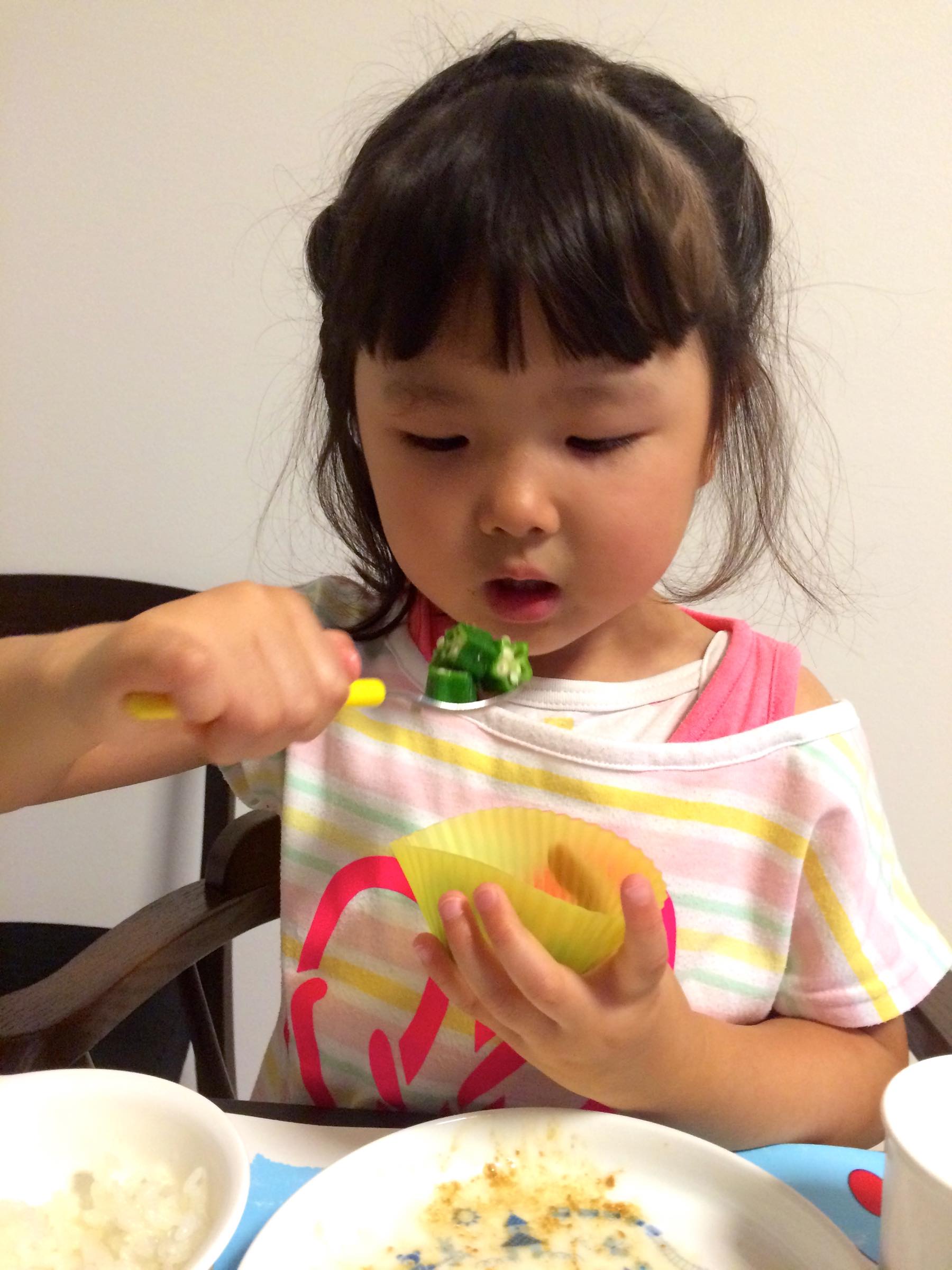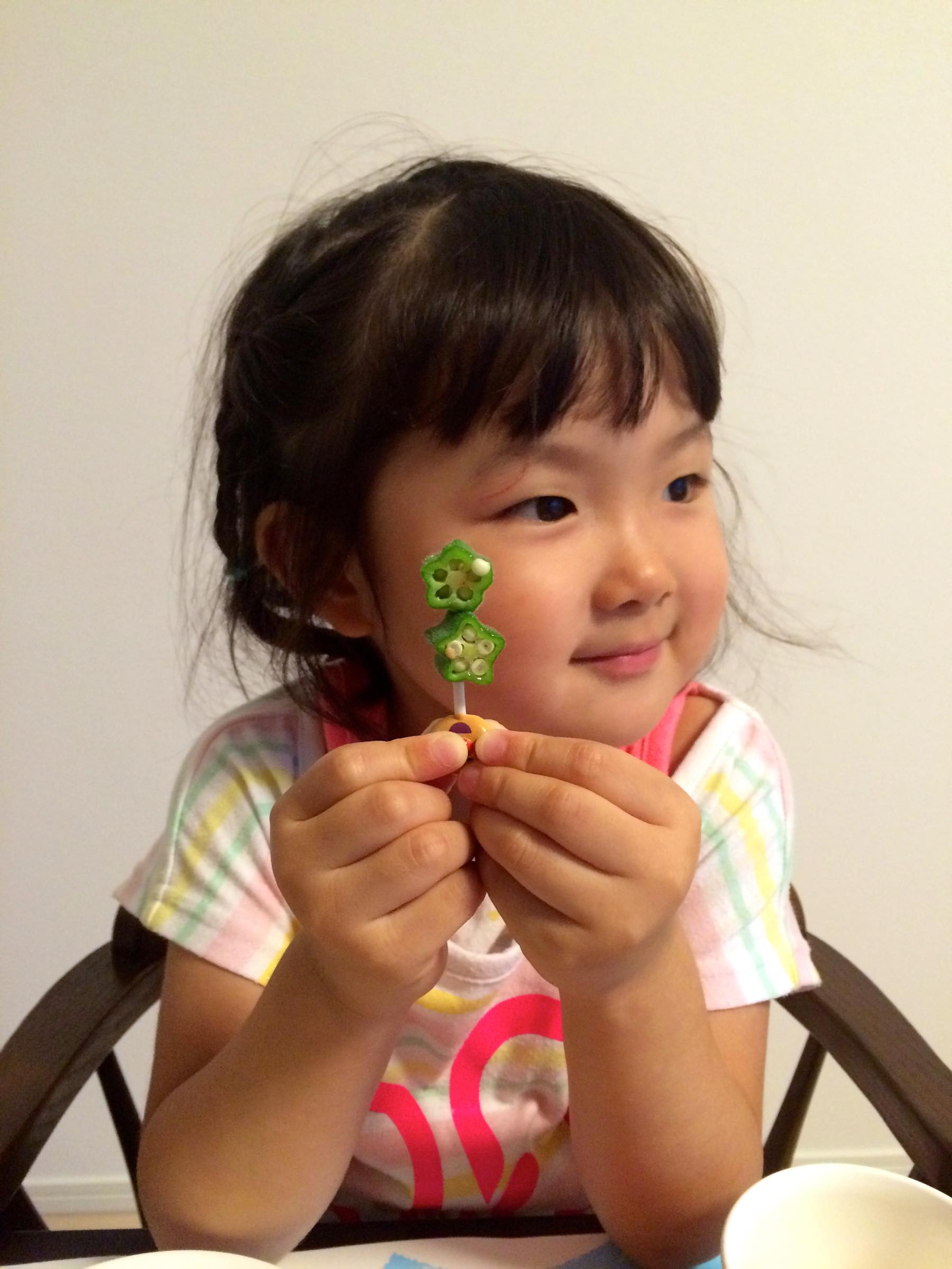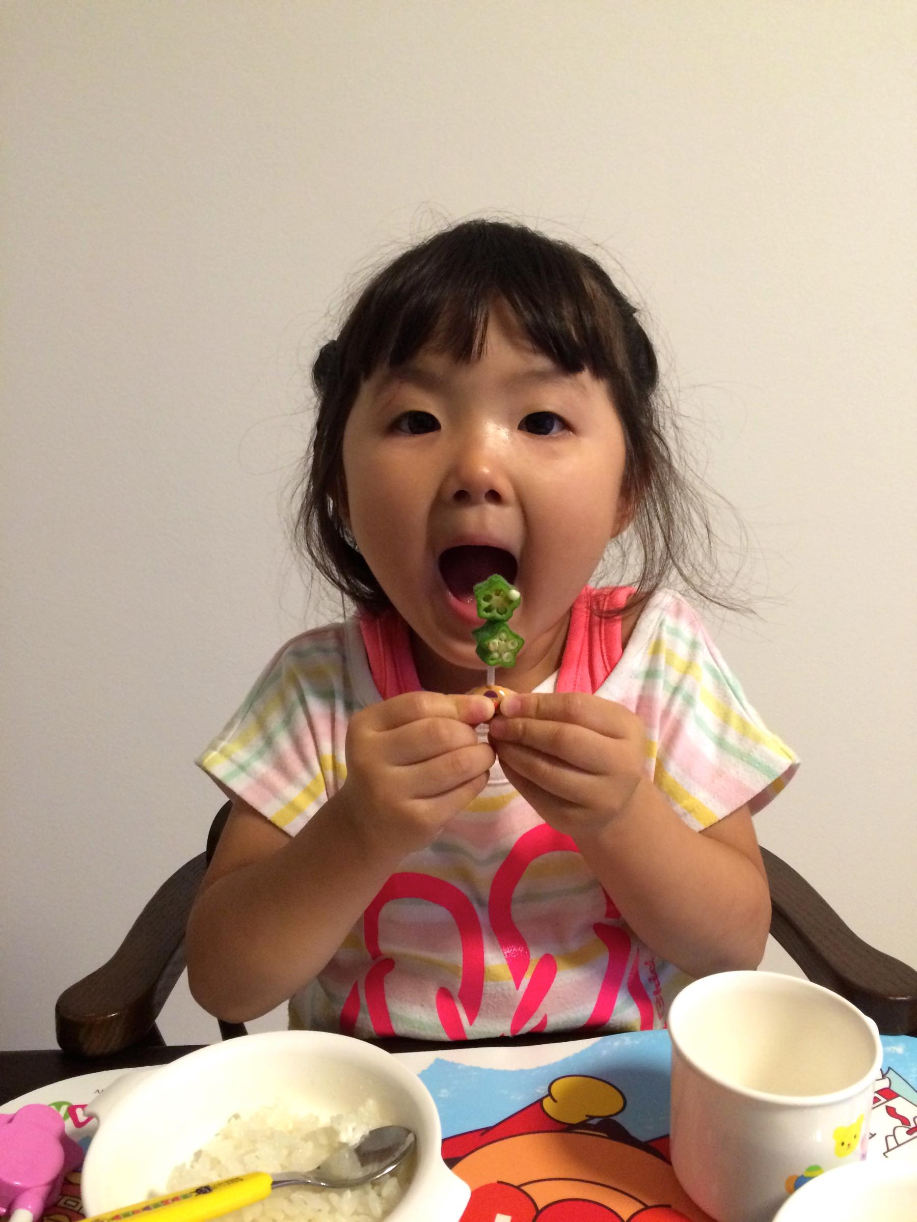 野菜を食べてほしくてアンパンマンのピックにオクラを刺して出してみたら大成功〜!パクパクと良く食べてくれ、最後はママの分まで食べてしまうほどでした。良かった、良かった。子供には見た目が大事って言うのは本当なんだなーと思いました。