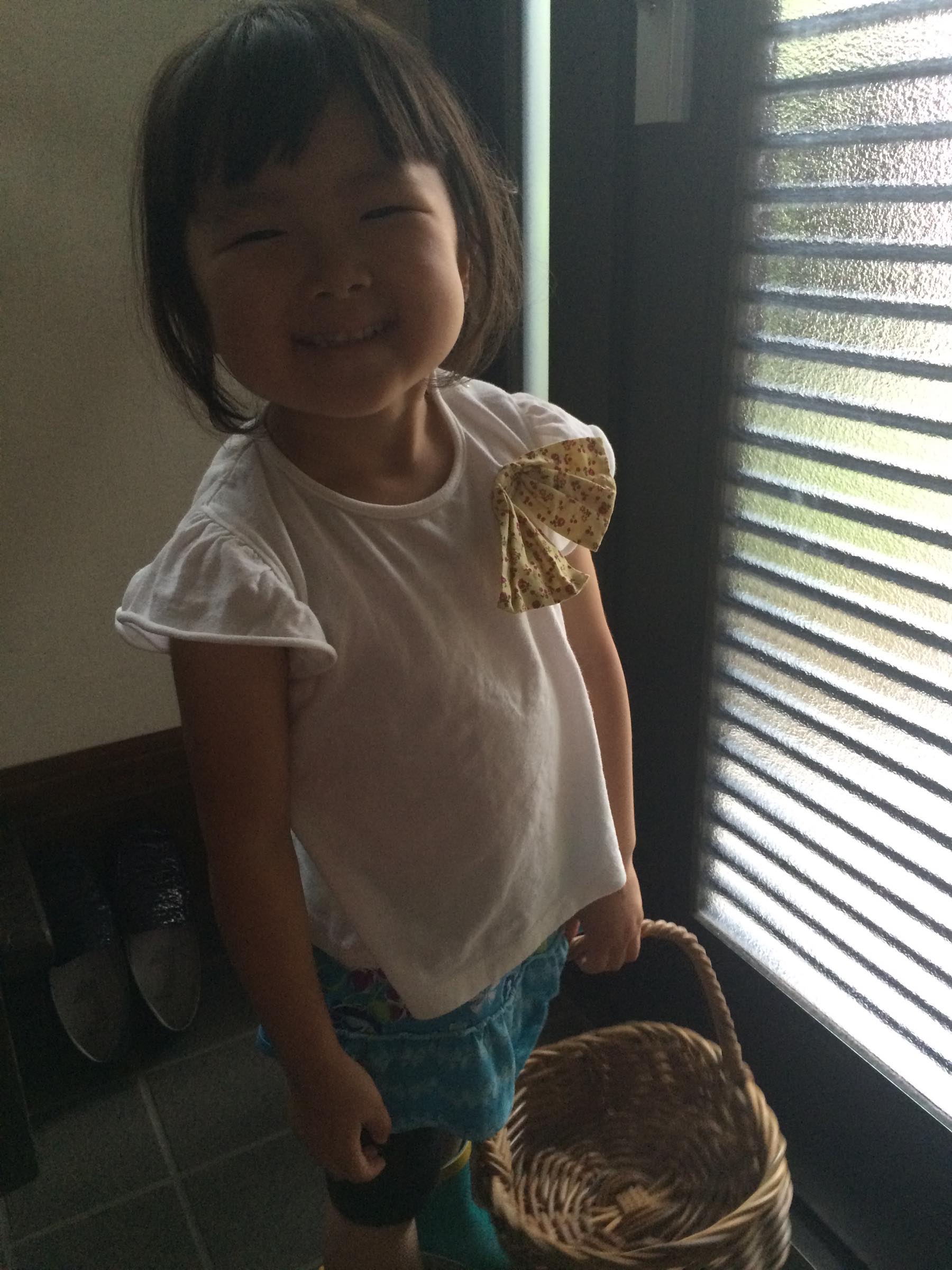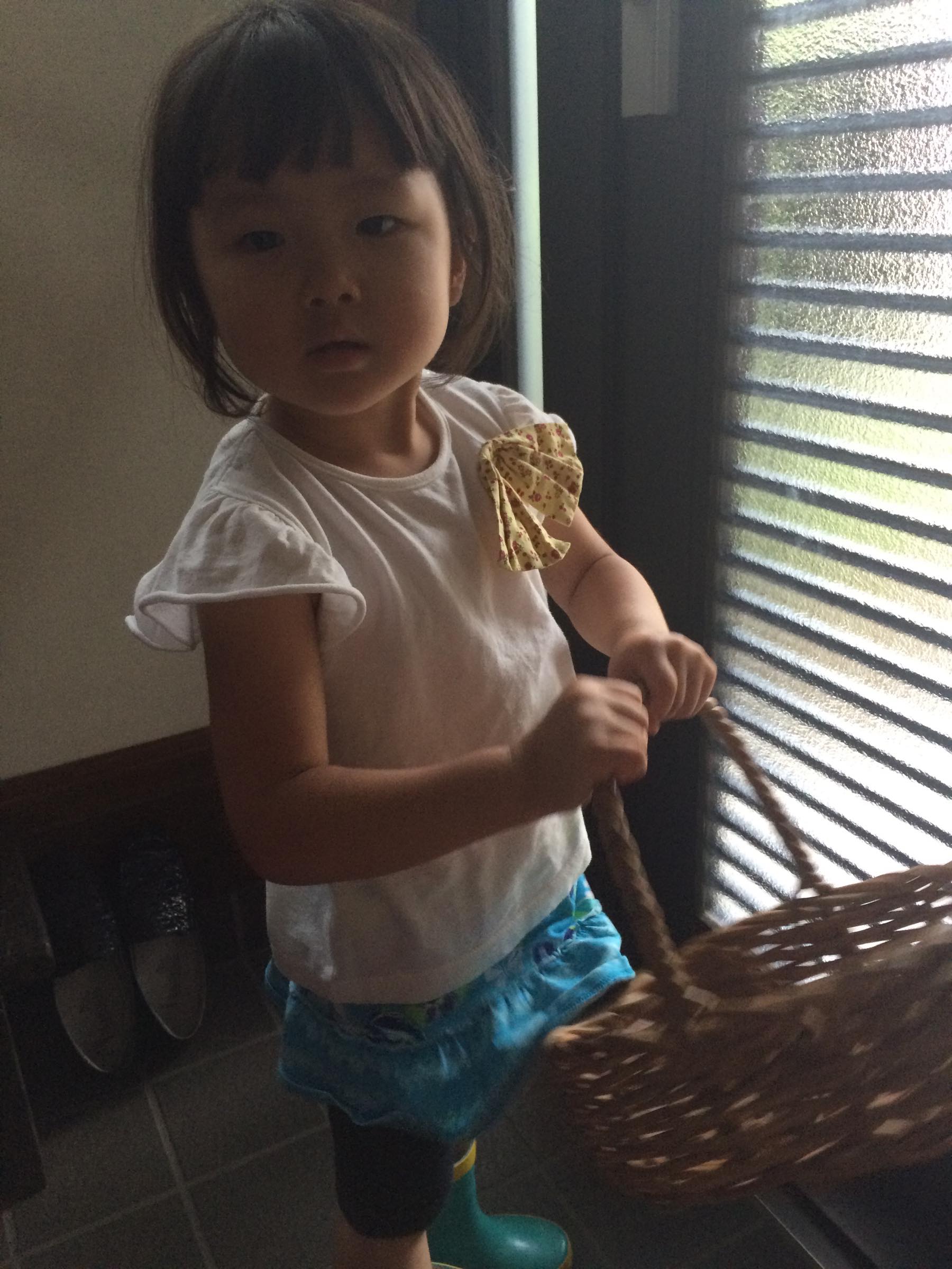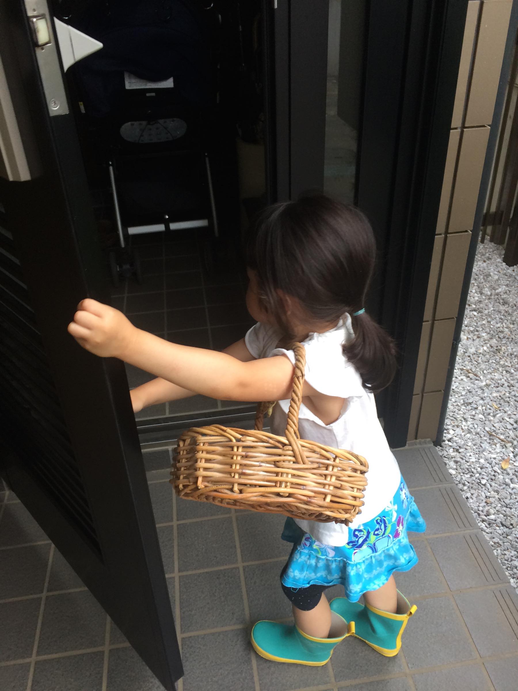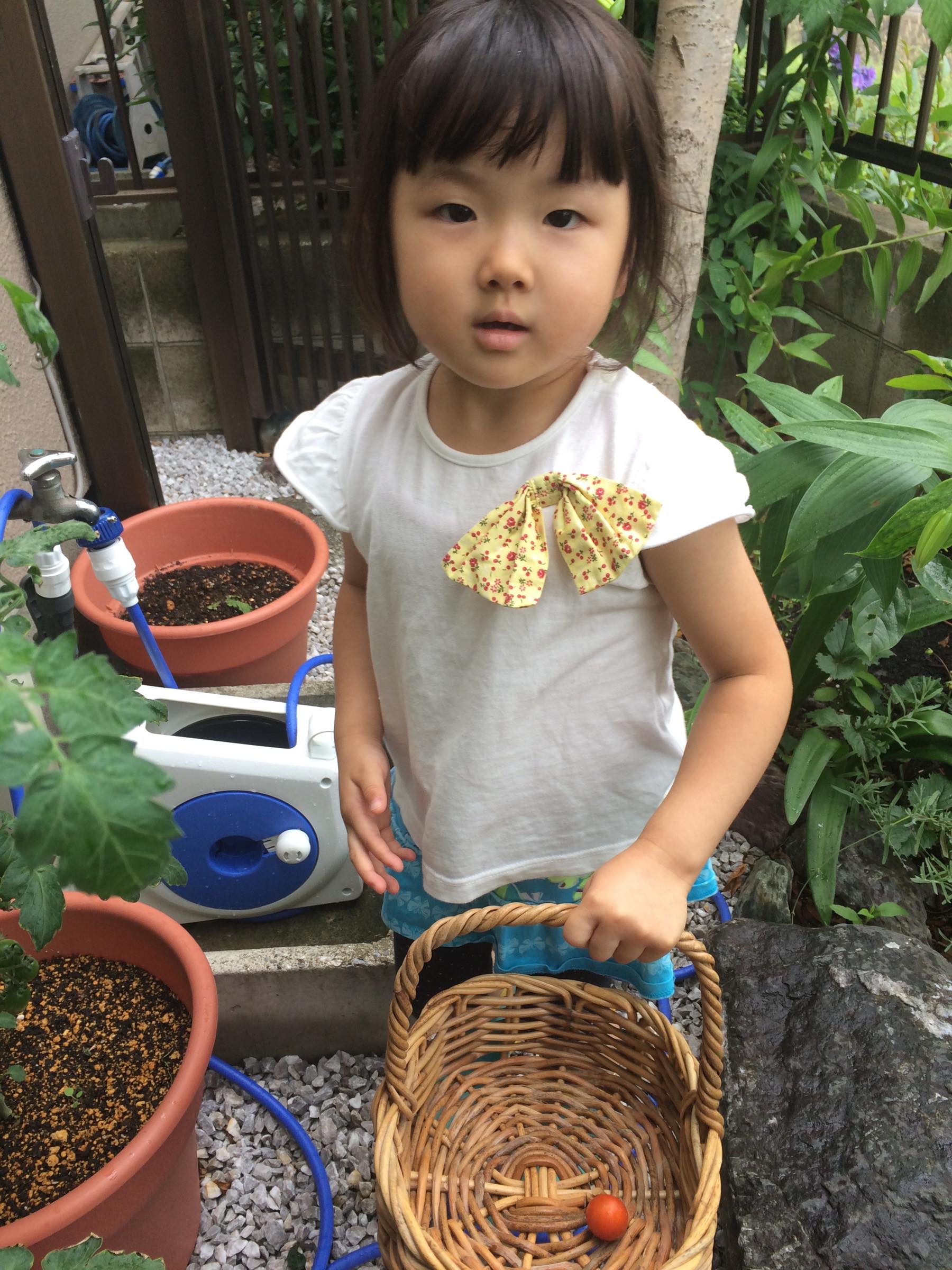 祖母宅でプチトマトの収穫をお手伝いしてきました!カゴを持ってウキウキで出かけるこのちゃん。