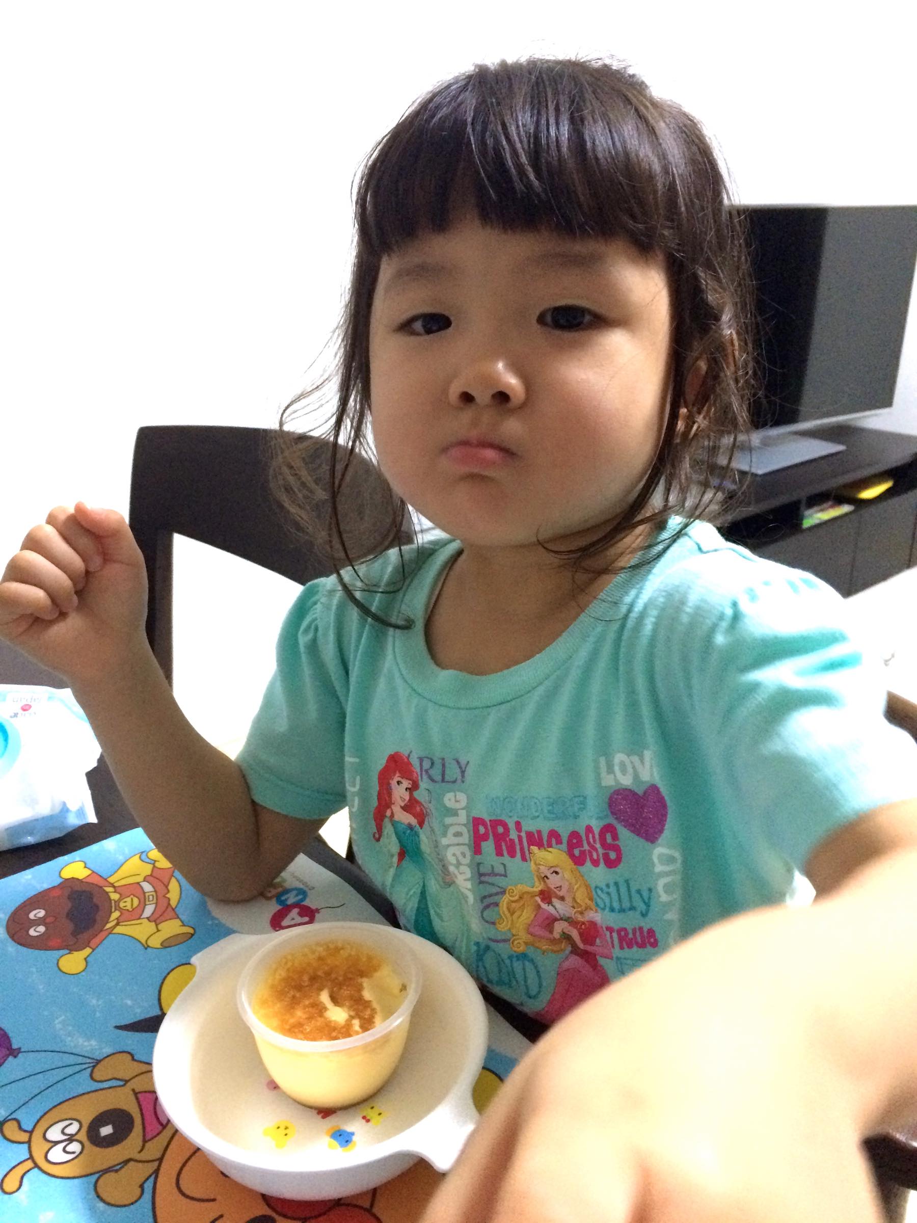 小学校に上がるまでに卵除去を解除したいので、卵を使った食品を食べる練習をぼちぼちがんばっています。今日はデザートにプリンを食べることにしました。
