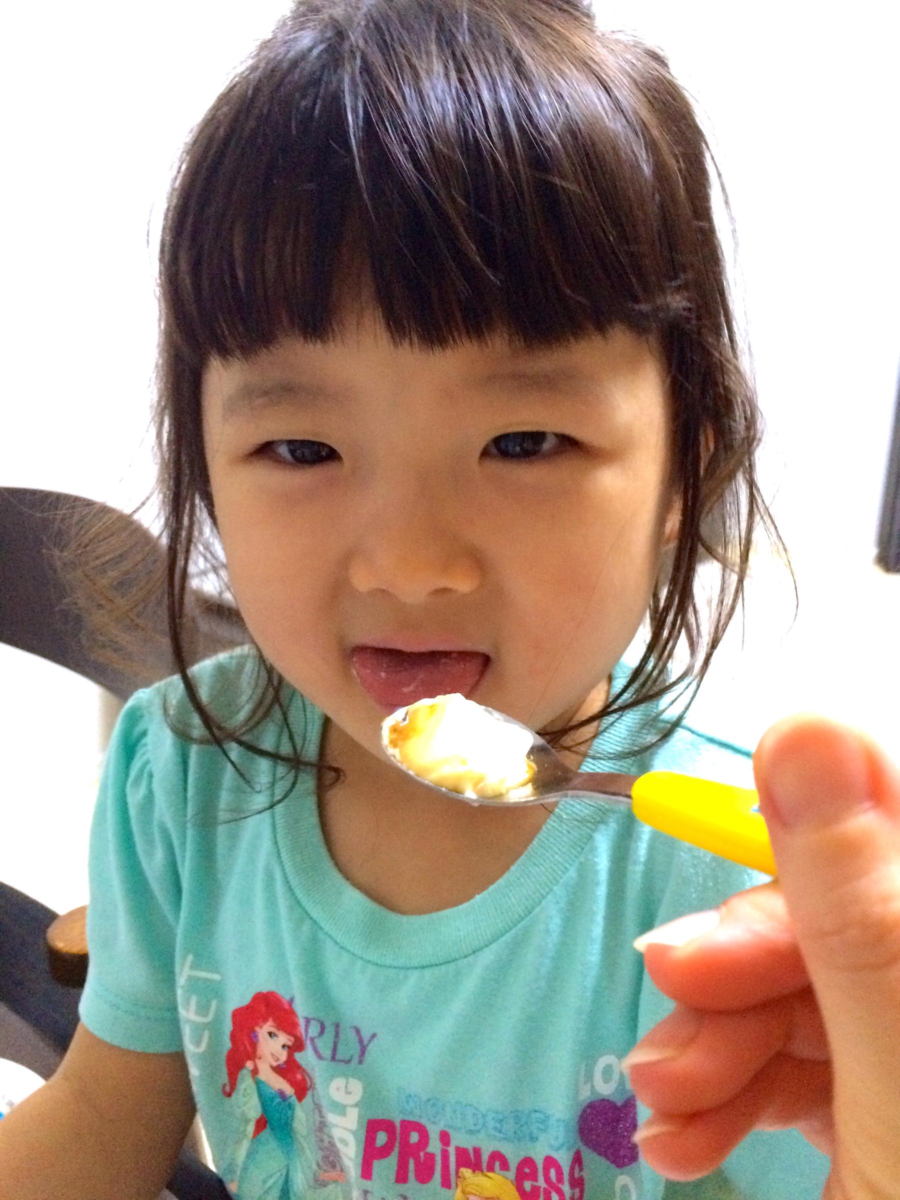 前は見ただけで嫌がっていたけれど「カラメルソースが甘くておいしいよ〜」と誘ってみると一口食べてくれました。味はやっぱりあまり好きではないみたいでそれ以上は進めても食べてくれなかったけれど、口の周りが赤くなることはなく特に発疹も出ることはありませんでした。次は半分くらい食べてくれるようになるといいなぁ。