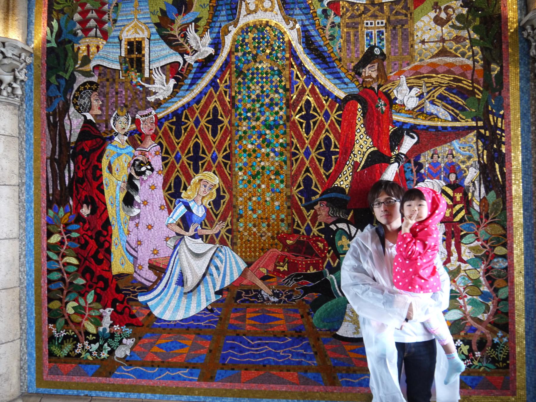 ディズニーランドは11ヶ月のときにきた以来で、今はキャラクターもたくさん知っているので楽しみにしてきました。さっそくシンデレラの壁画を発見!