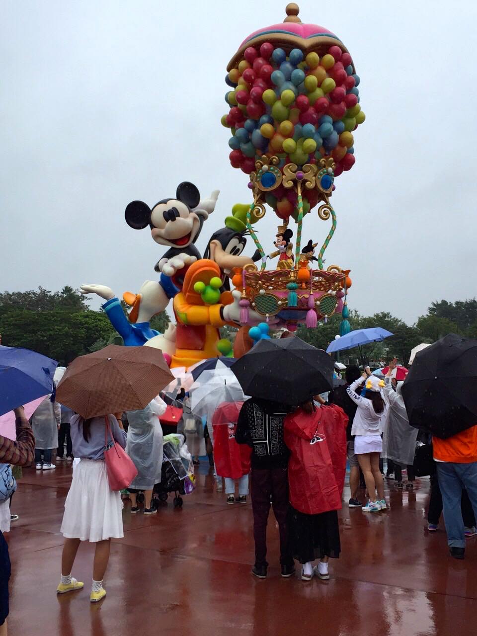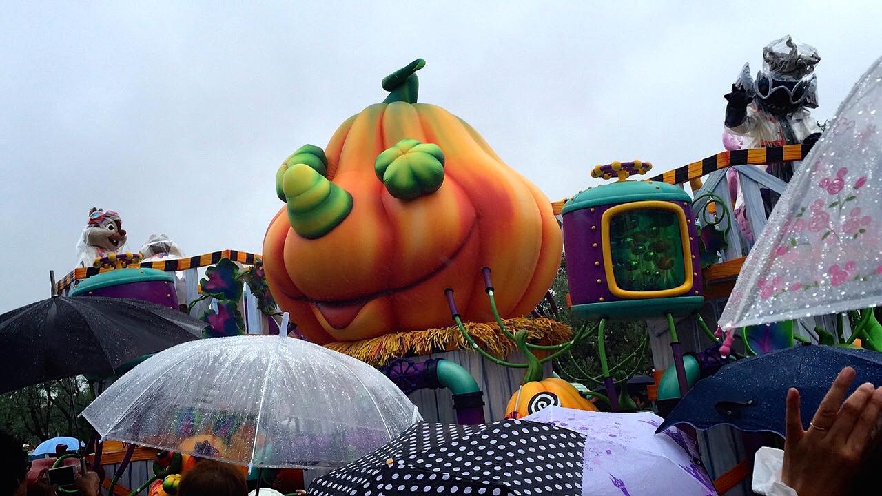 ハロウィンと日中のパレードを2つみました。キャラクターたちはレインコートを着て手を振ってくれました。