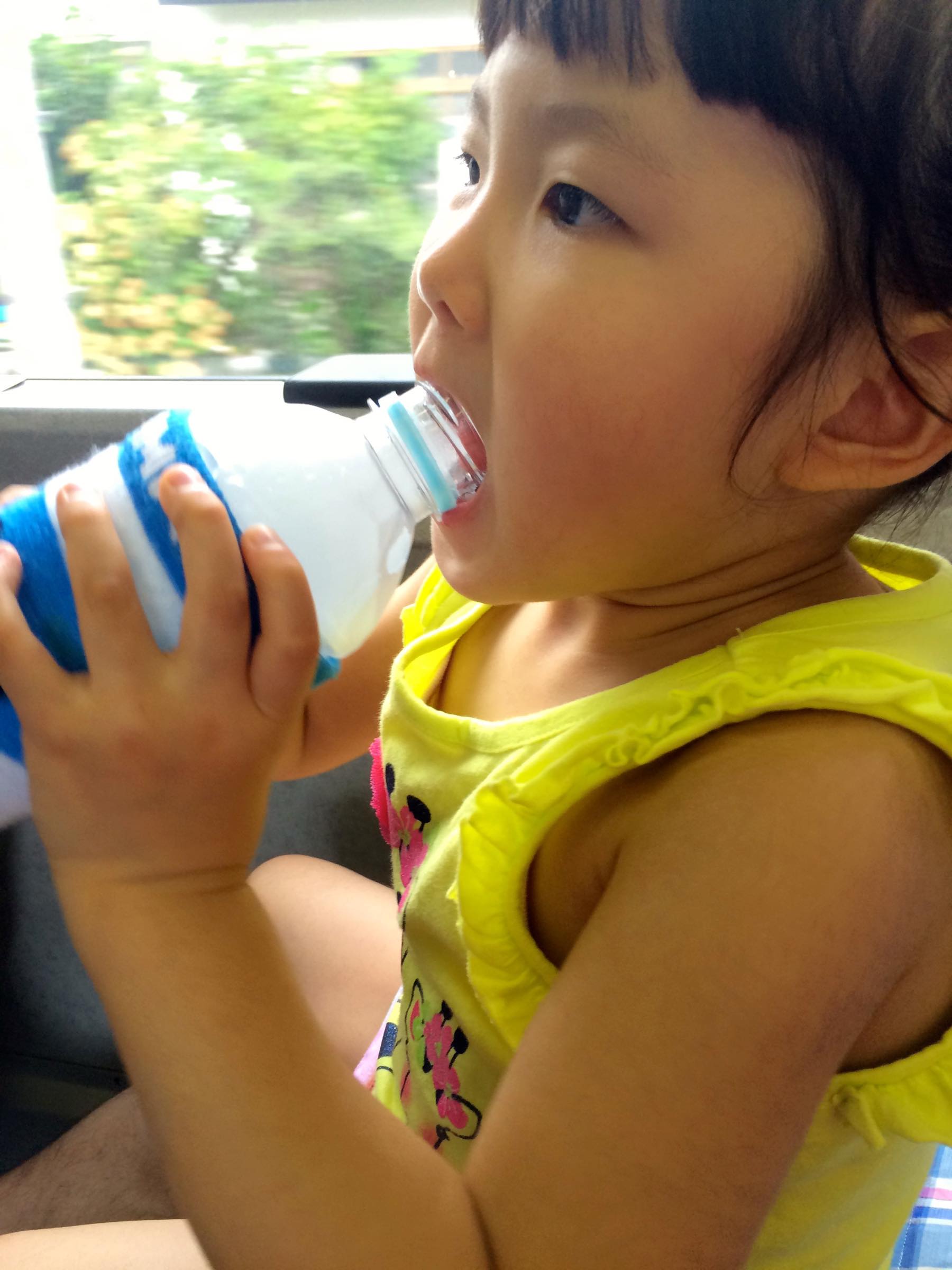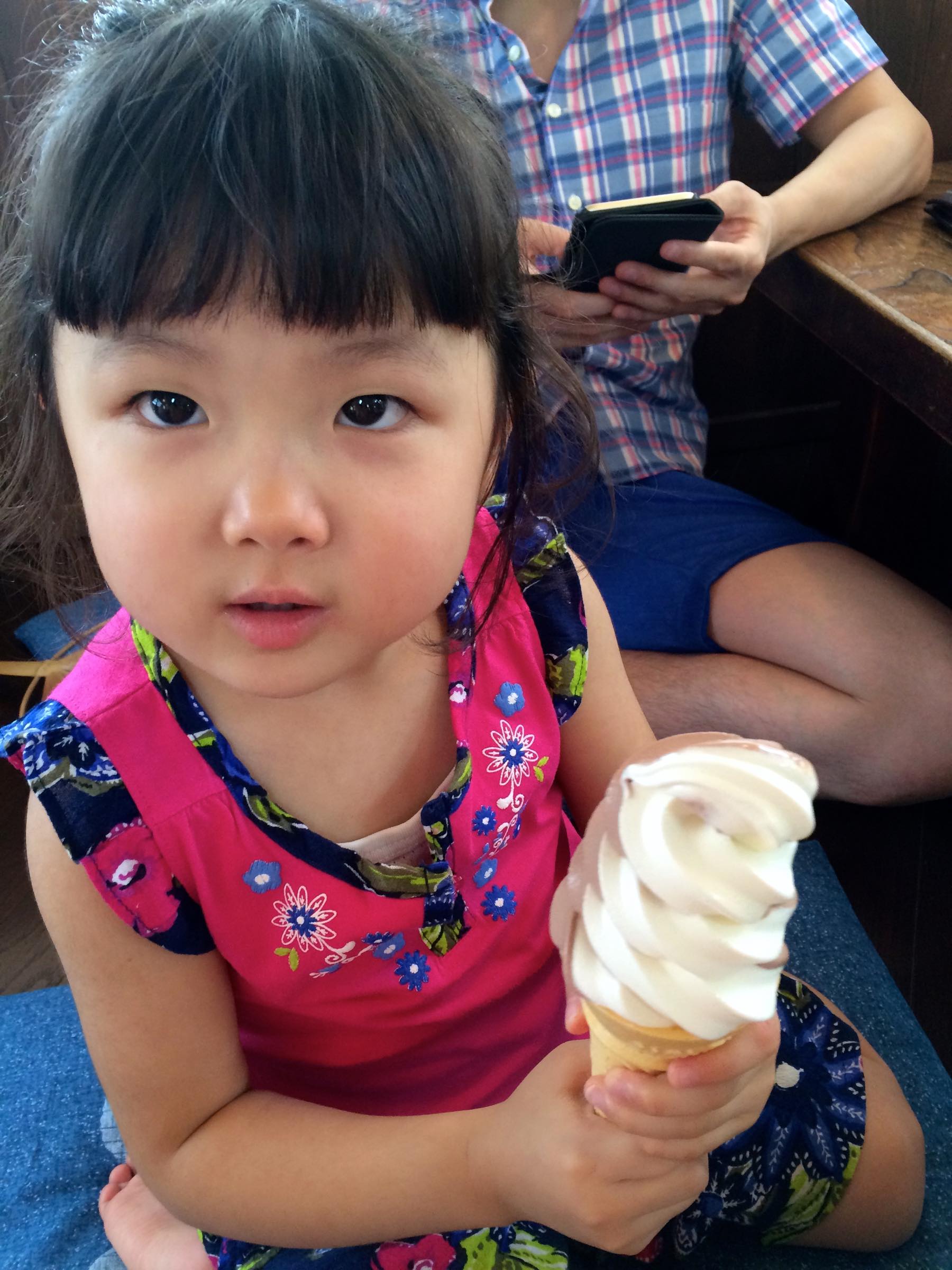食後、ママが買ったソフトクリームをどうせ食べないだろうと思って「どうぞ」とあげると一口ぺろっとしたところ、とうとうアイスの美味しさに気付いてしまったようです。